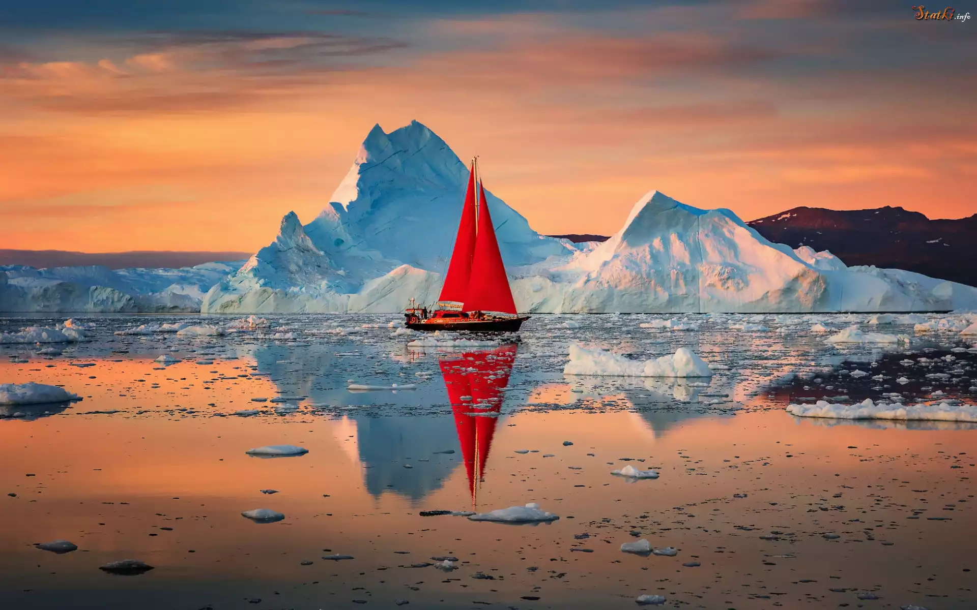 Góry lodowe, Morze, Odbicie, Wschód słońca, Żaglówka, Czerwone, Żagle