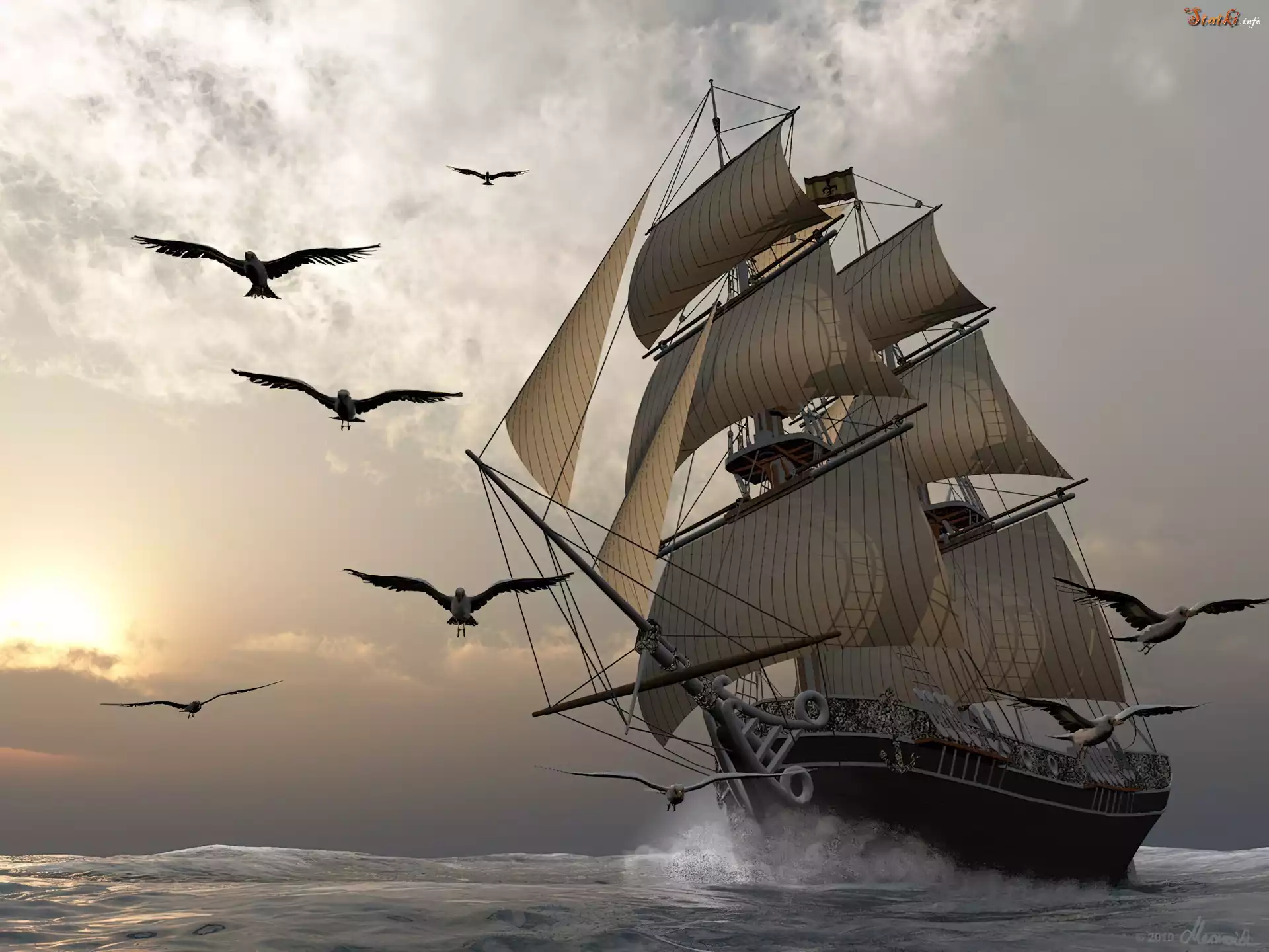 Statek Morze, Żaglowiec, Mewy