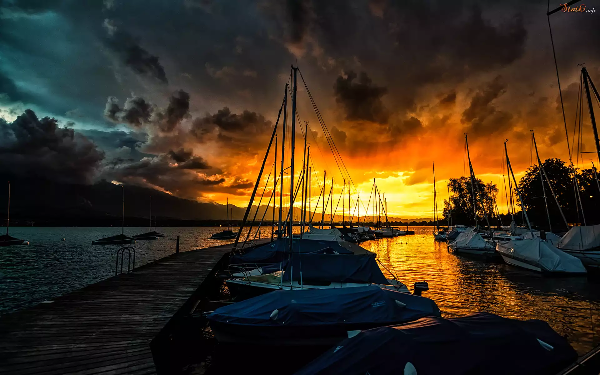 Statek Jezioro, Żaglówki, Pomost, Zachód słońca, Chmury, Drzewa