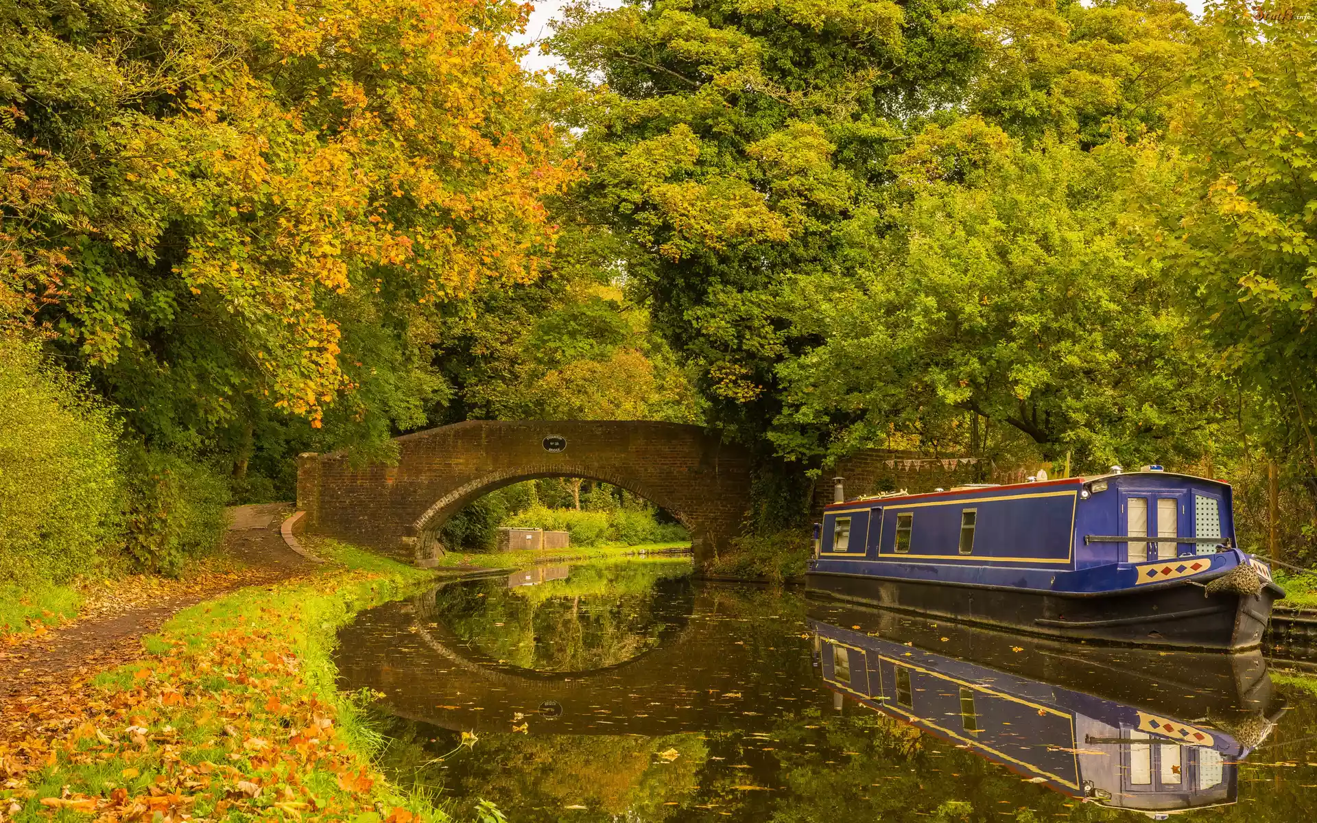 Anglia, Hrabstwo Worcestershire, Miasto Kidderminster, Park, Drzewa, Most, Barka, Rzeka, Kanał, Staffordshire and Worcestershire Canal, Jesień |