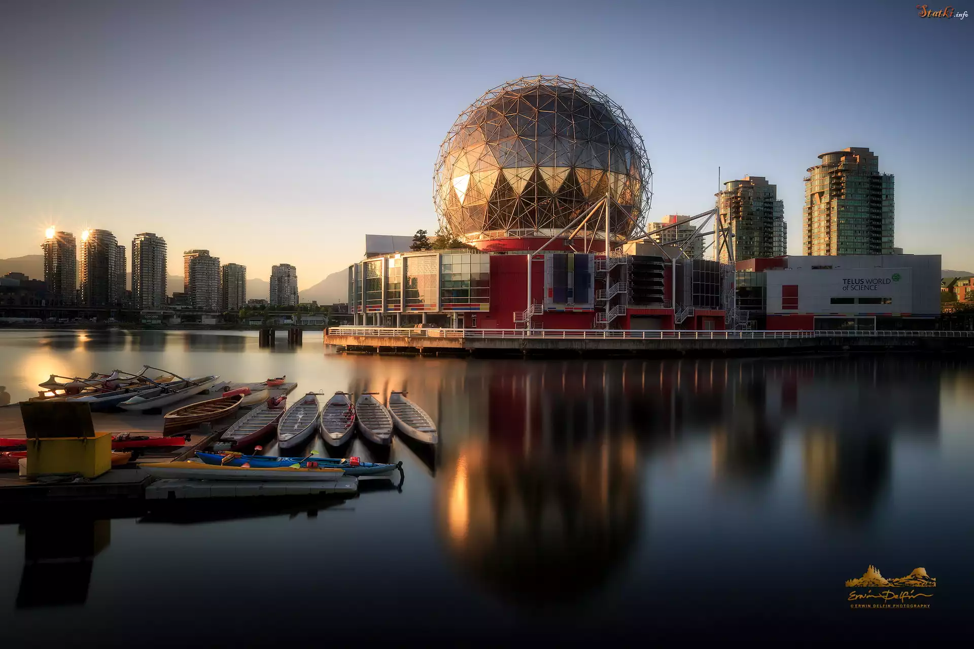 Kopuła, Muzeum Nauki, Science World at TELUS, Rzeka Fraser, Kajaki, Vancouver, Kanada