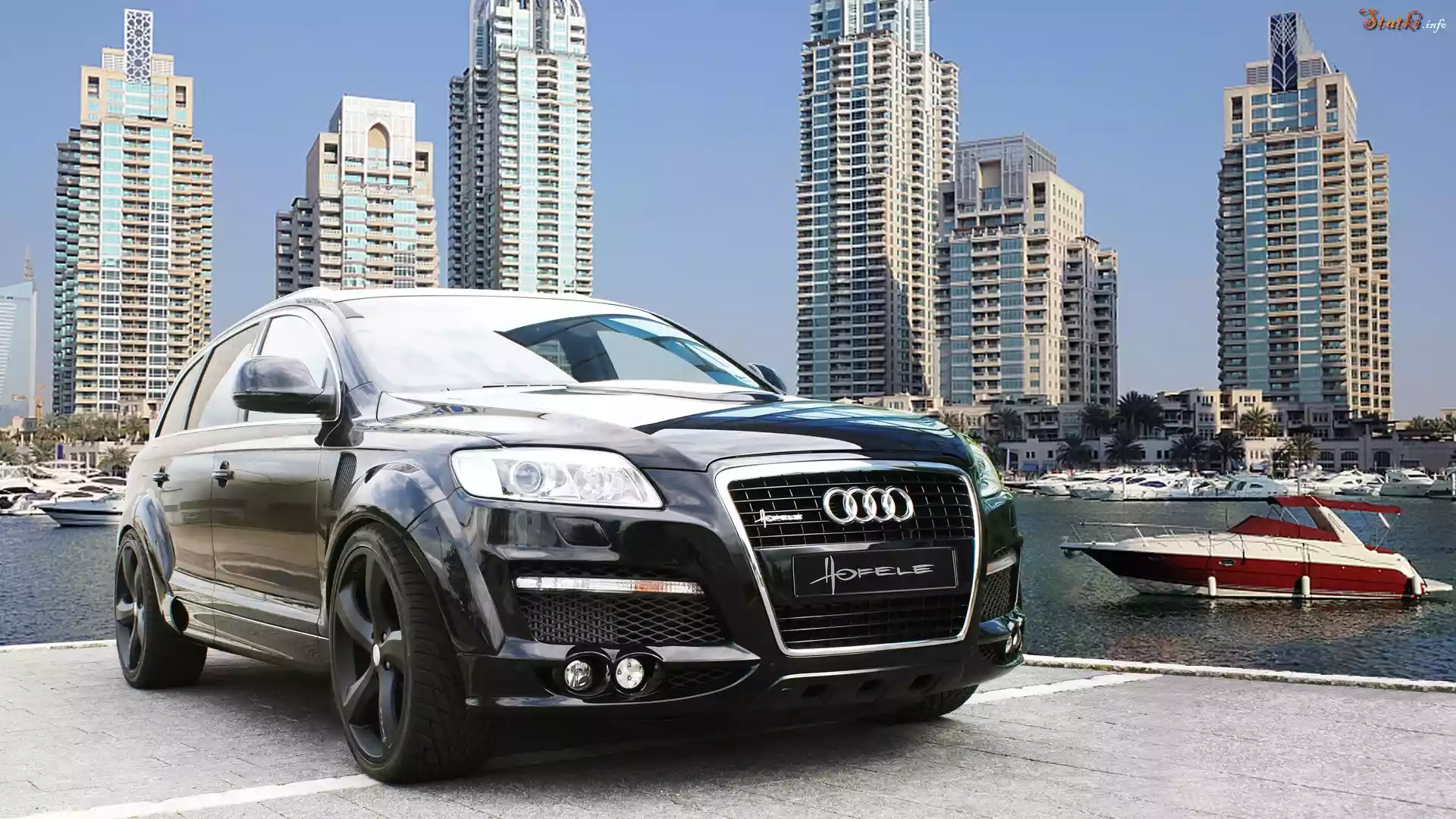 Statek Audi Q7, Wieżowce, Miasto, Rzeka, Łódka