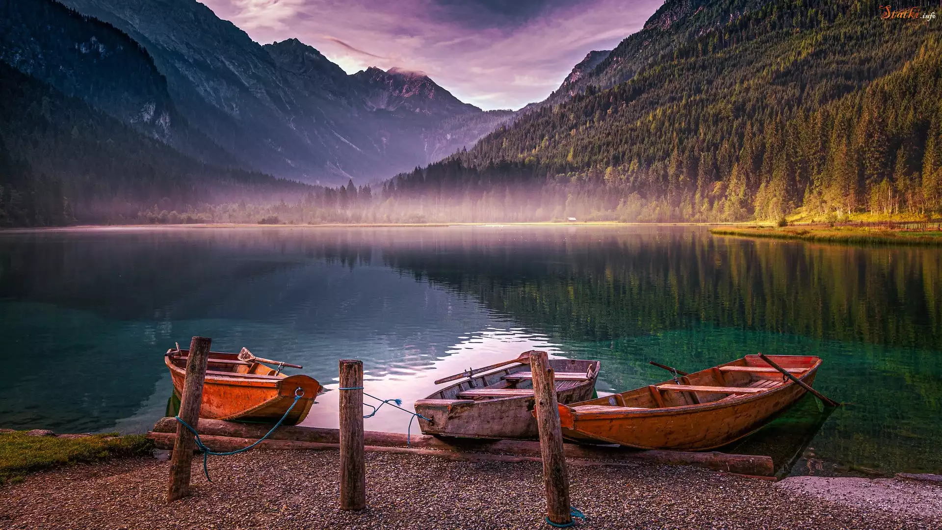 Statek Góry, Jezioro Jagersee, Drzewa, Mgła, Trzy, Łódki, Pale, Austria