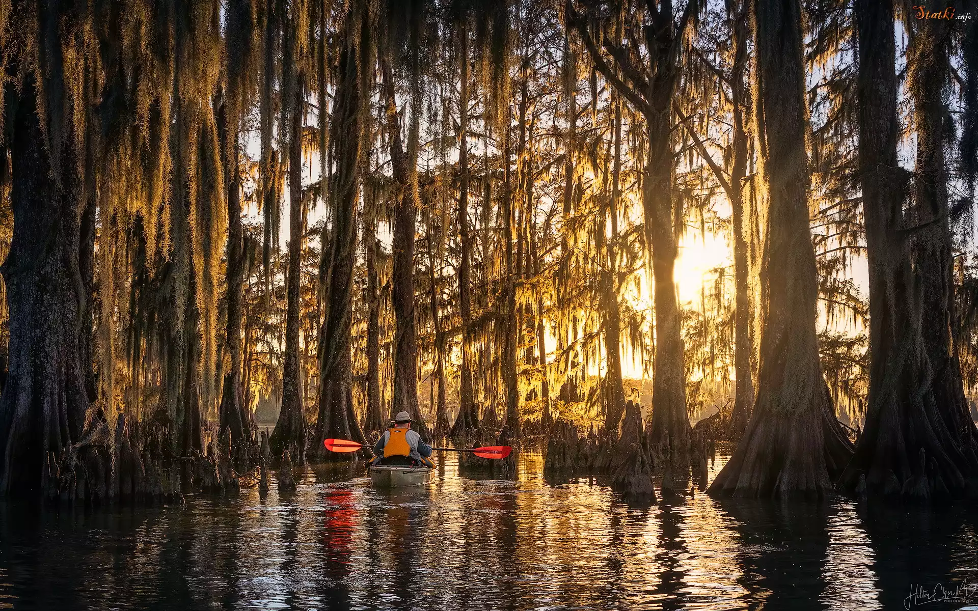 Mokradło, Atchafalaya, Drzewa, Cyprysy bagienne, Zwisający, Mech hiszpański, Oplątwa brodaczkowa, Kajak, Luizjana, Stany Zjednoczone |