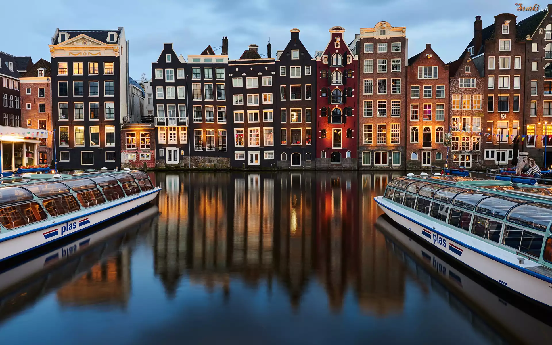 Statek Holandia, Amsterdam, Kanał wodny, Statki rzeczne, Odbicie, Budynki