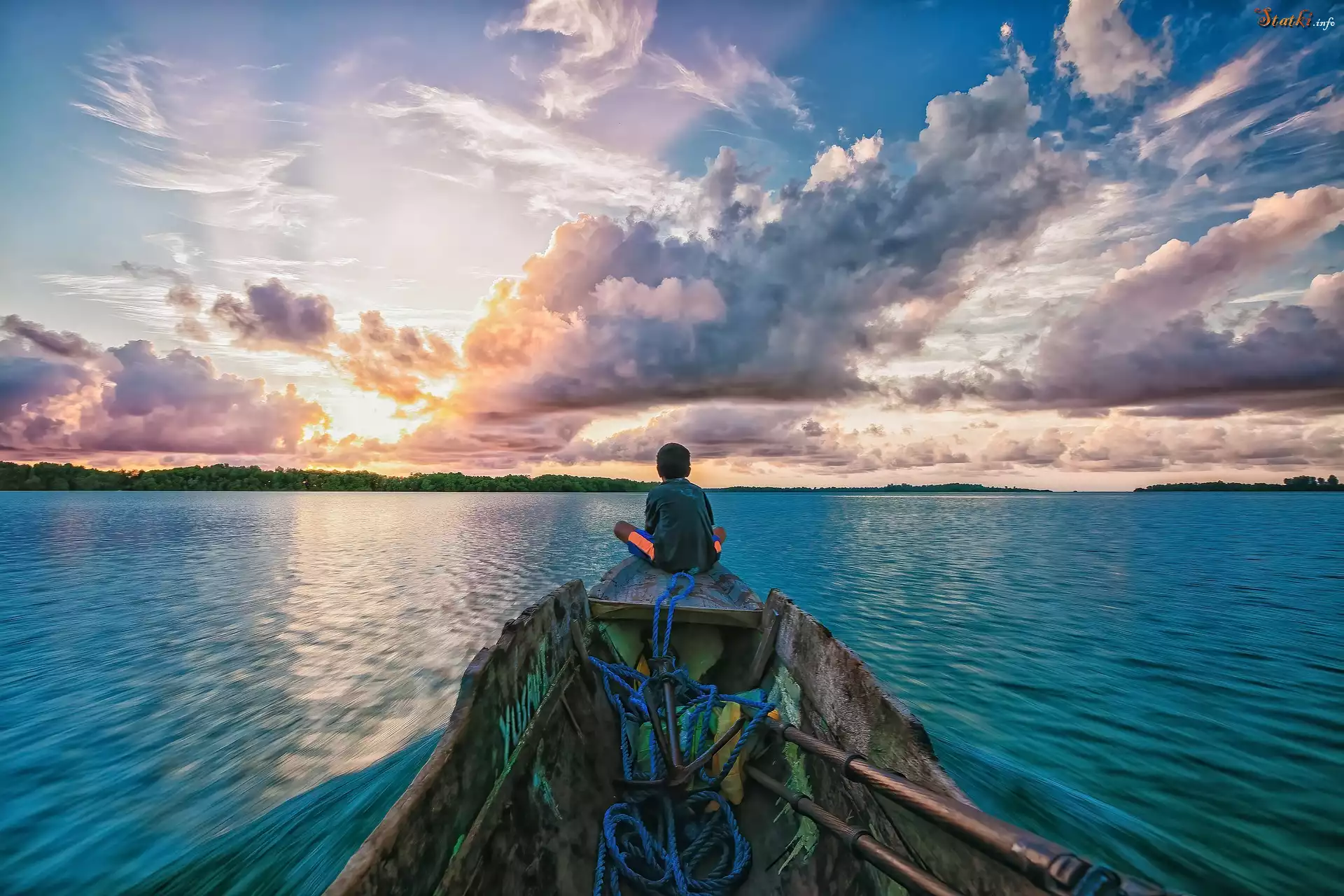 Laguna, Morze, Łódka, Chłopiec, Niebo, Chmury