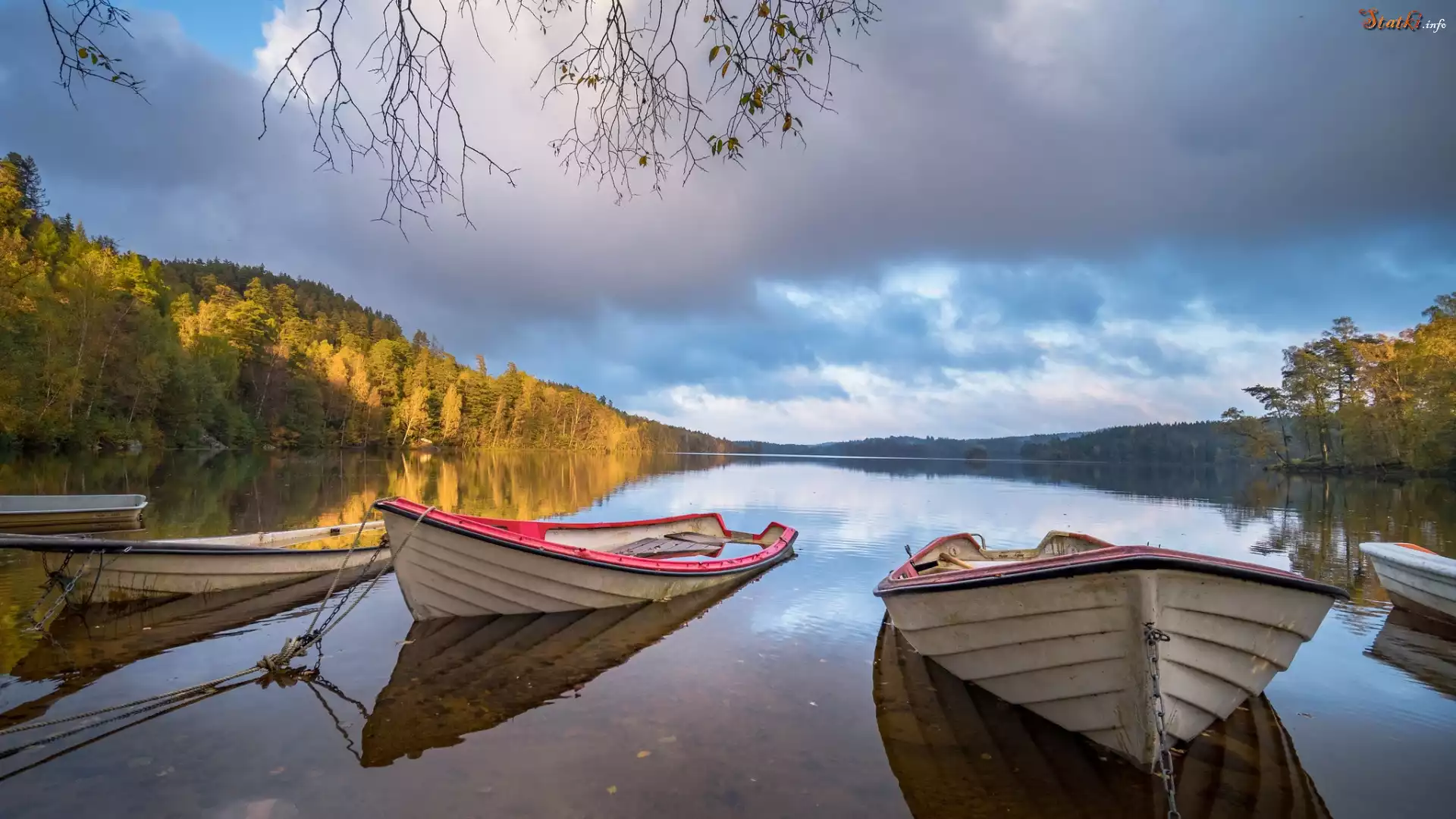 Statek Jesień, Jezioro, Łódki, Chmury