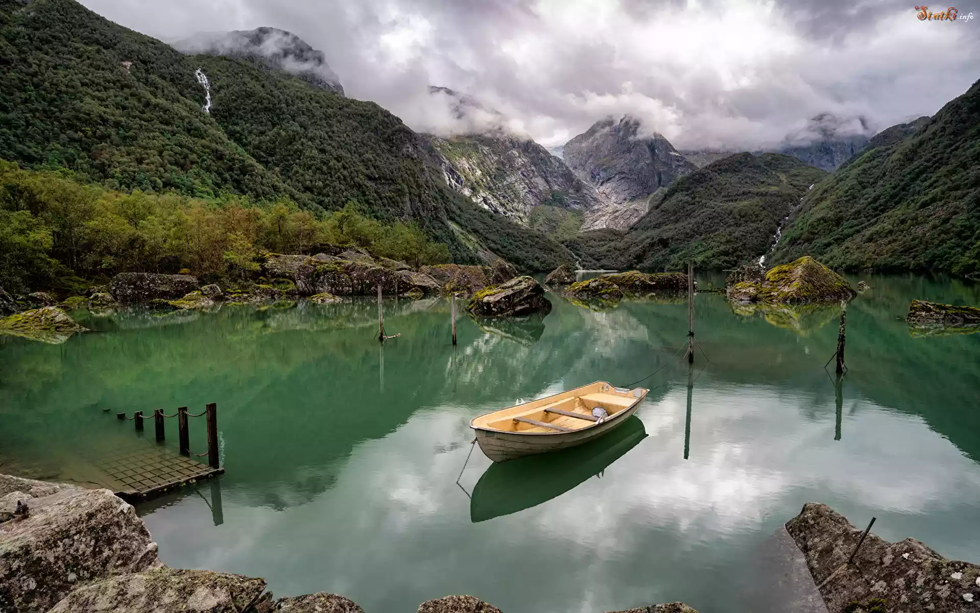 Jezioro, Lake Bondhusvatnet, Łódka, Góry, Chmury, Skały, Drzewa, Park Narodowy Folgefonna, Norwegia