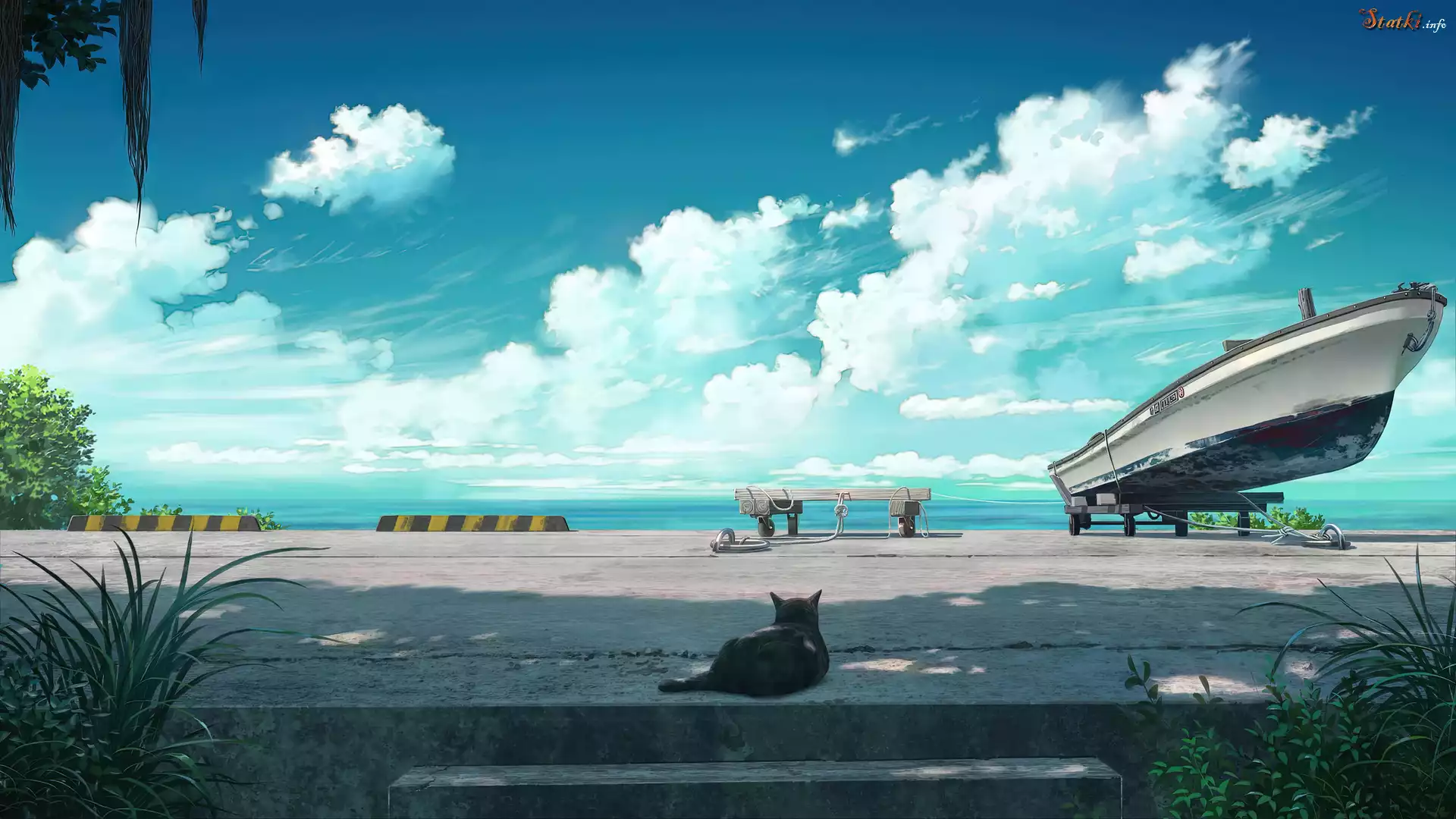 Statek Niebo, Chmury, Kot, Łódka, Nabrzeże