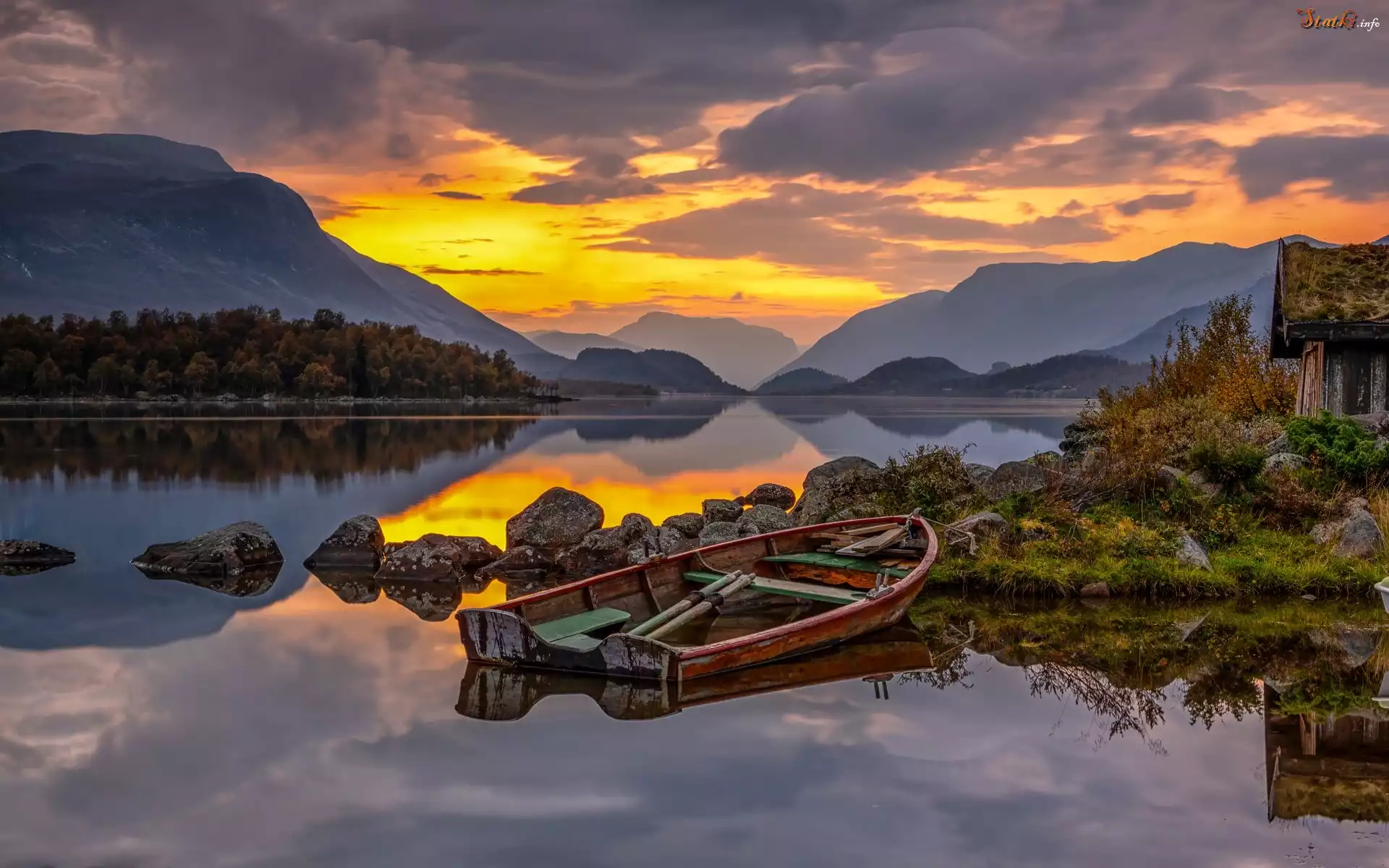 Góry, Jezioro, Łódka, Kamienie, Drzewa, Zachód słońca, Chmury