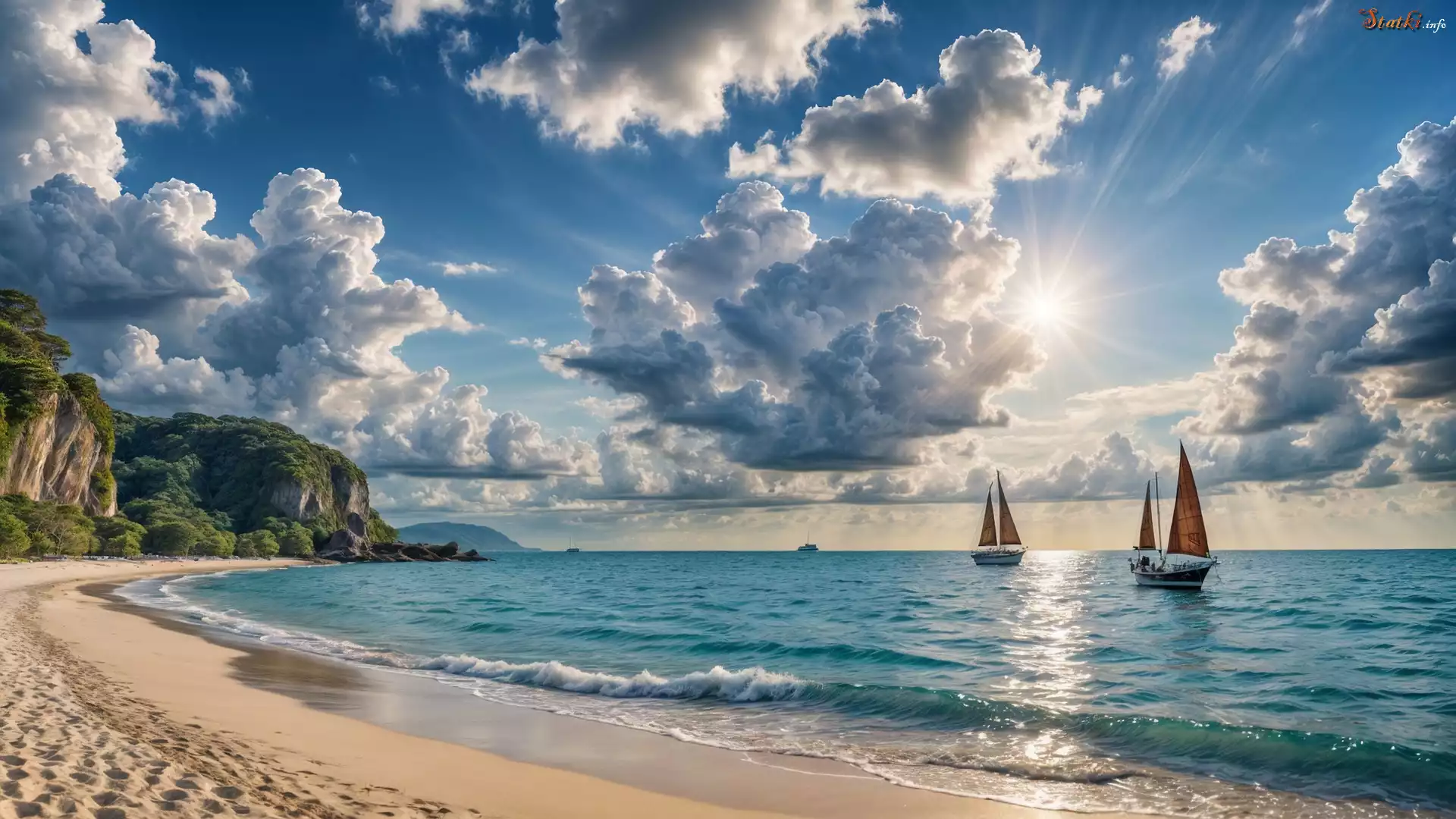 Morze, Plaża, Żaglówki, Chmury