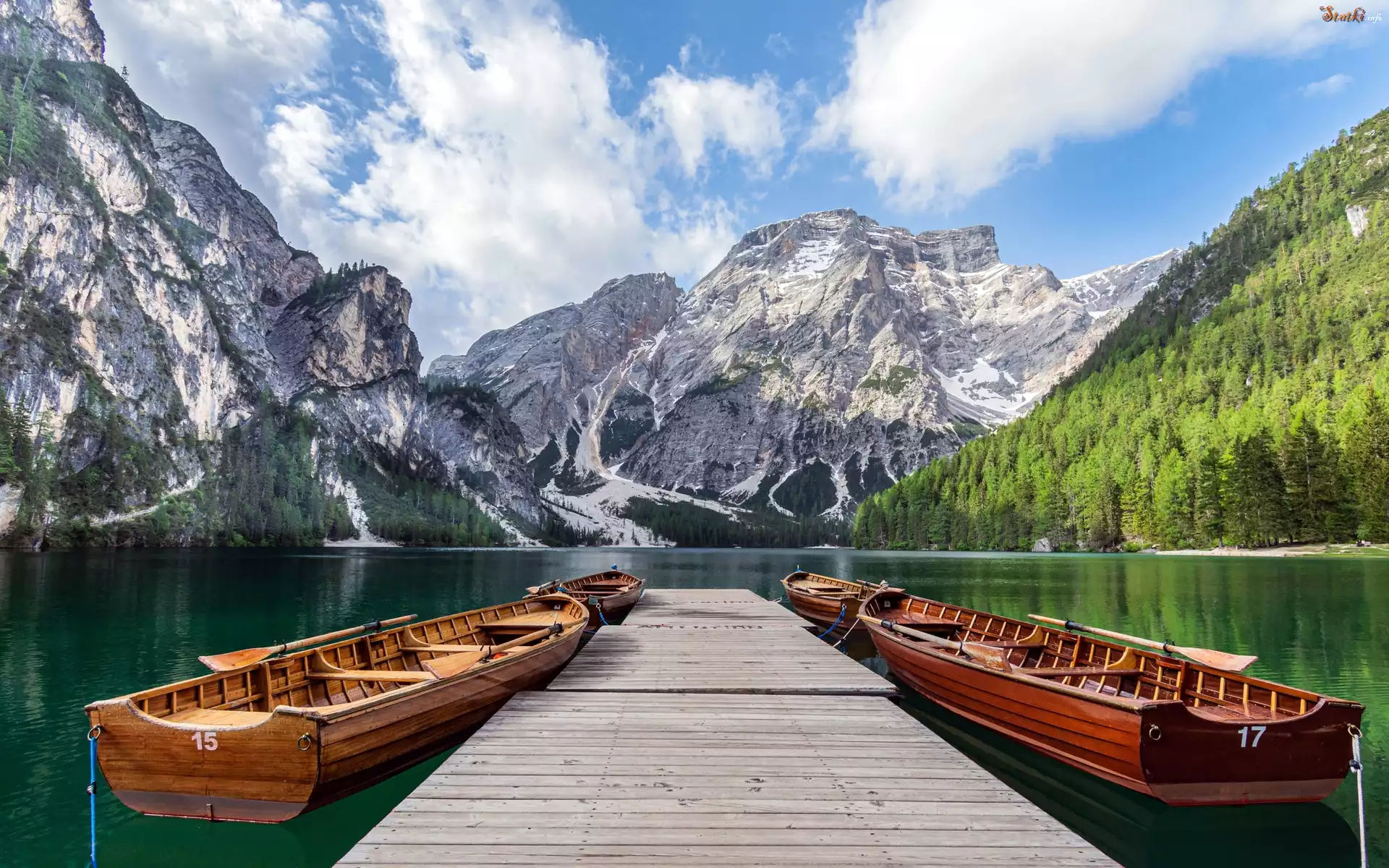 Jezioro Pragser Wildsee, Lago di Braies, Góry, Dolomity, Łódki, Pomost, Lasy, Południowy Tyrol, Włochy |