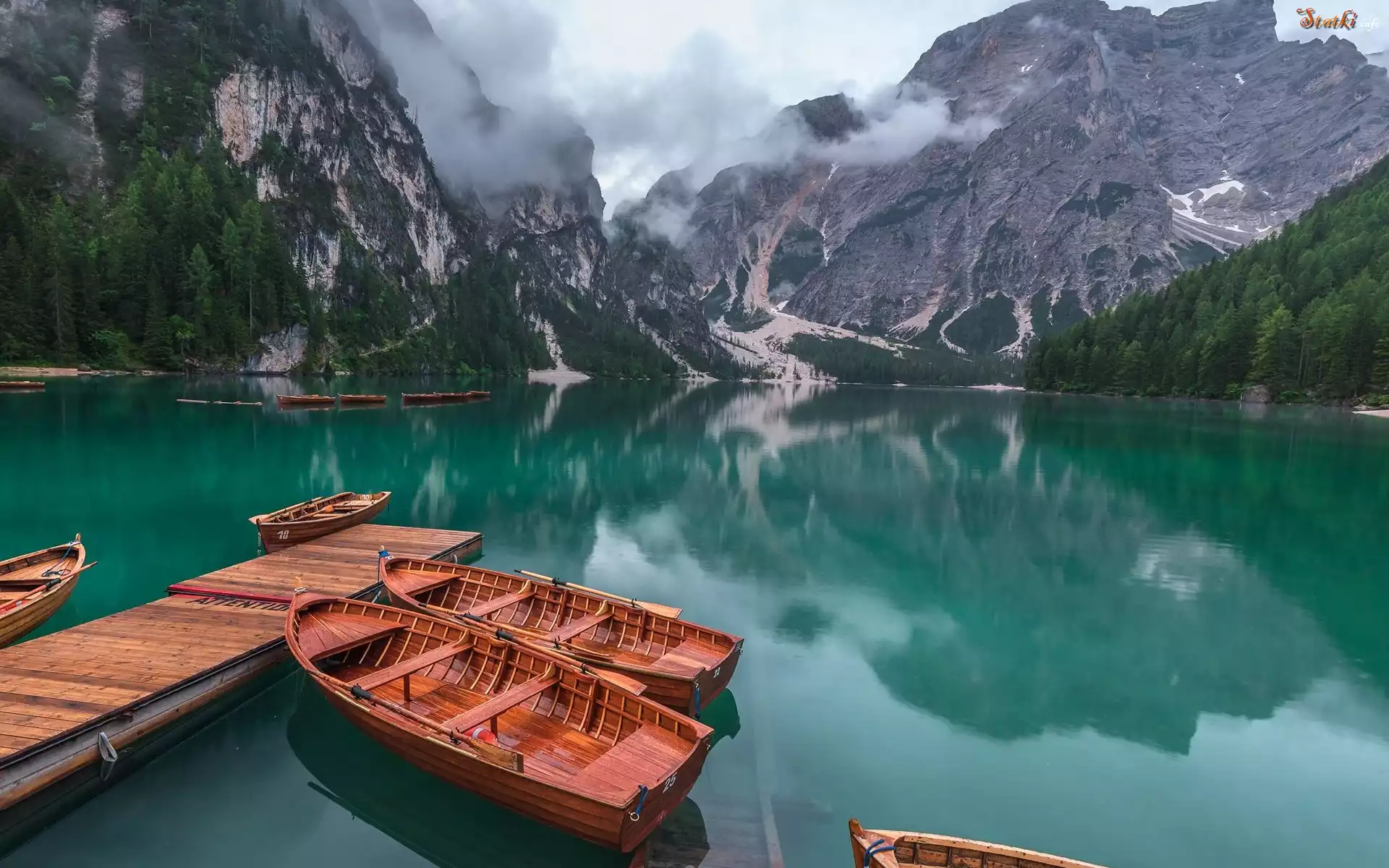 Statek Włochy, Jezioro Pragser Wildsee, Lago di Braies, Góry, Dolomity, Pomost, Łódki, Chmury