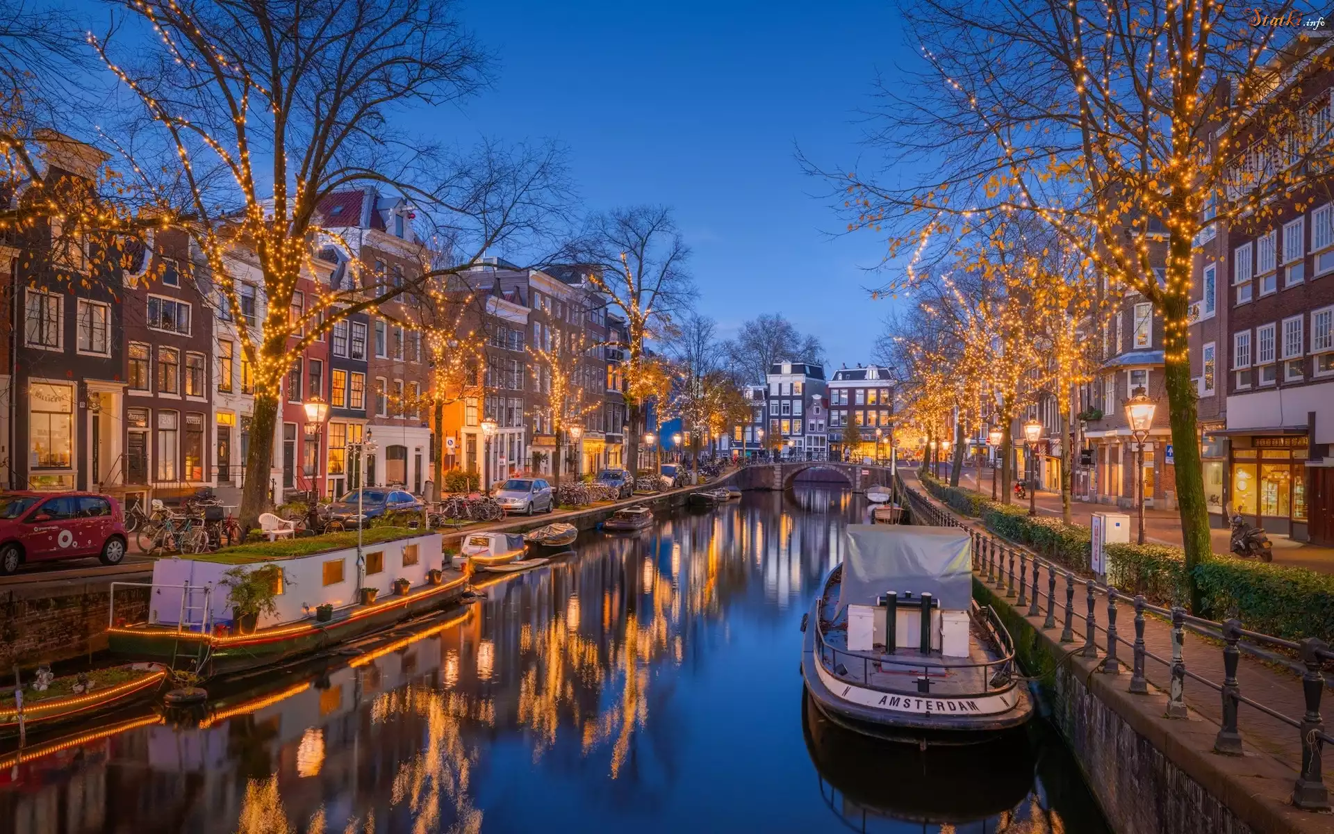 Statek Ulica, Domy, Kanał, Łódki, Lampa, Oświetlenie, Amsterdam, Holandia