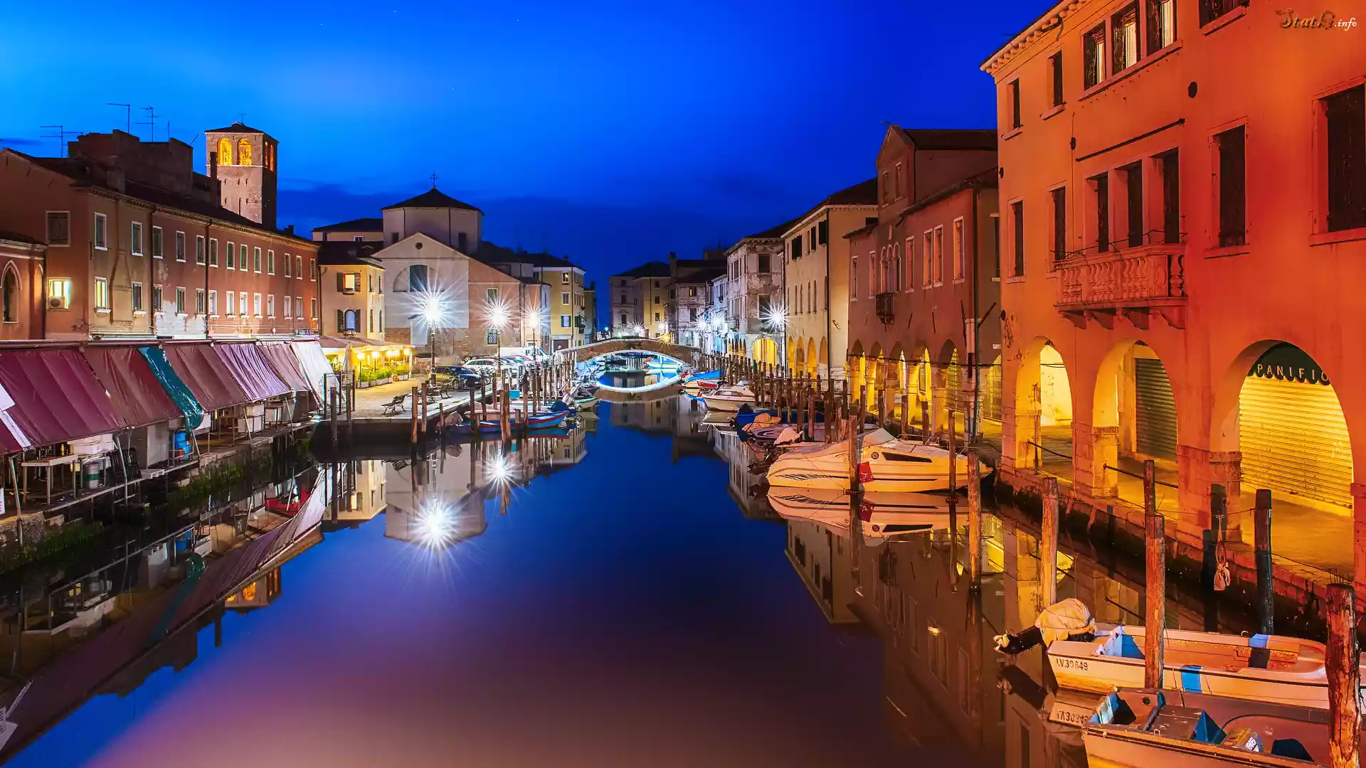 Statek Noc, Domy, Kanał, Most, Łódki, Chioggia, Wenecja, Włochy