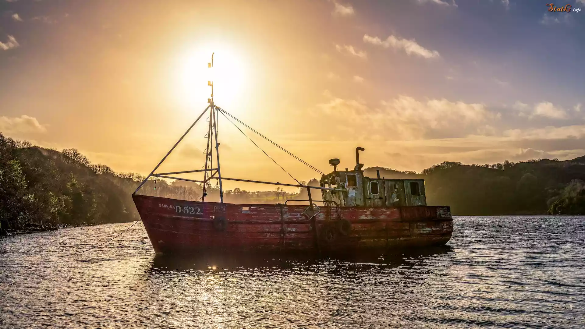 Statek Irlandia, Hrabstwo Donegal, Morze, Zatoka, Mulroy Bay, Promienie słońca, Kuter rybacki