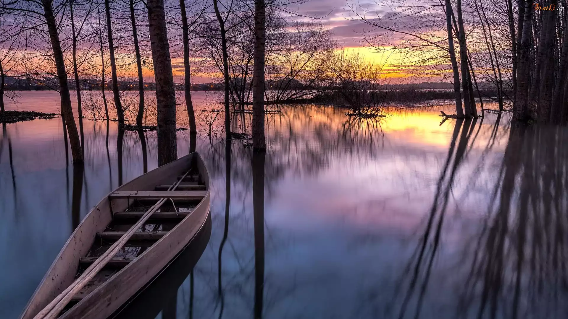 Jezioro, Drewniana, Łódka, Drzewa, Zachód słońca, Odbicie