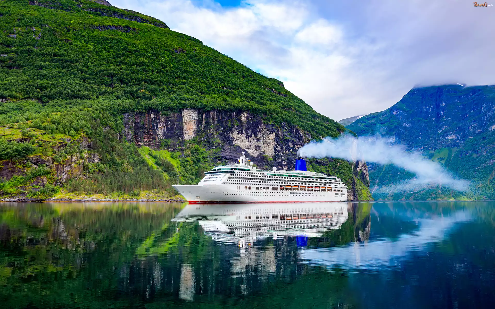 Statek Norwegia, Geiranger, Fiord Geirangerfjorden, Statek wycieczkowy, Pasażerski, Góry, Drzewa