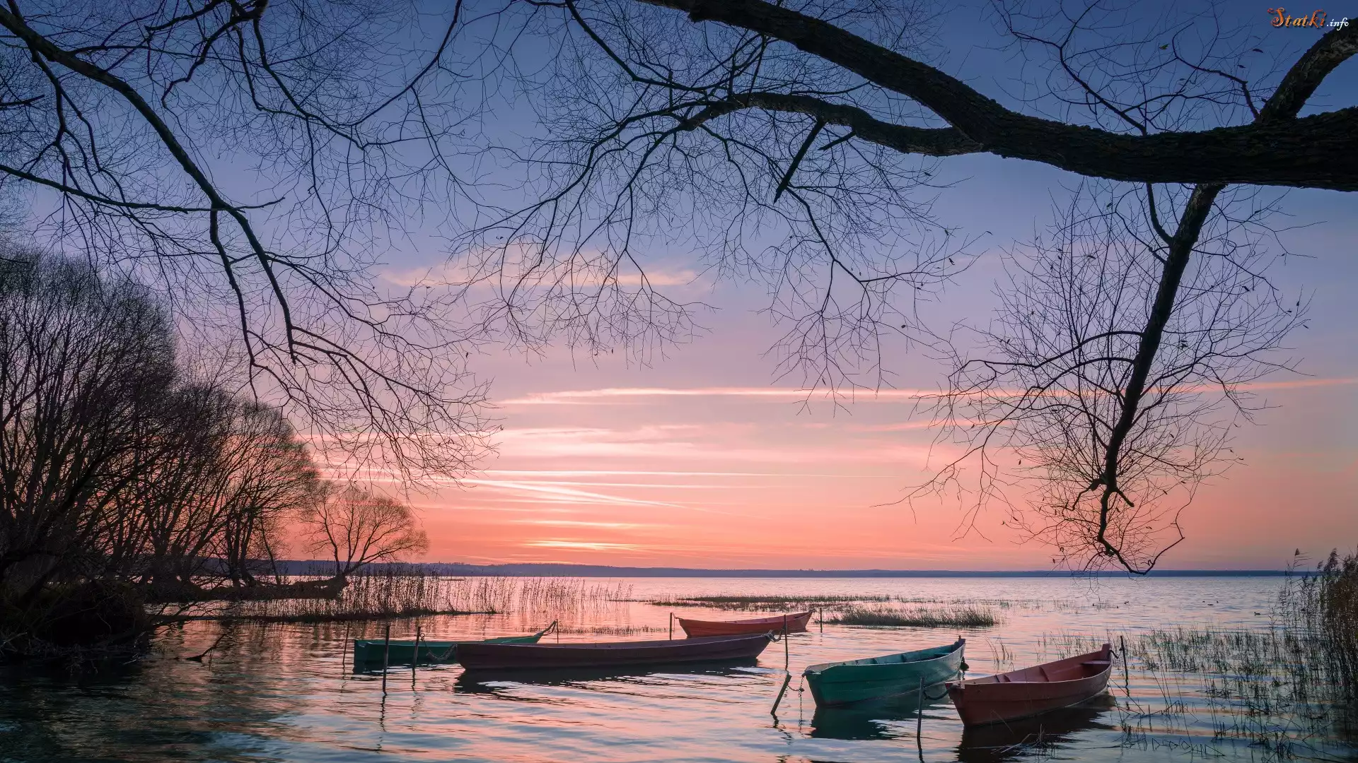 Zachód słońca, Łódki, Drzewa, Gałęzie, Jezioro