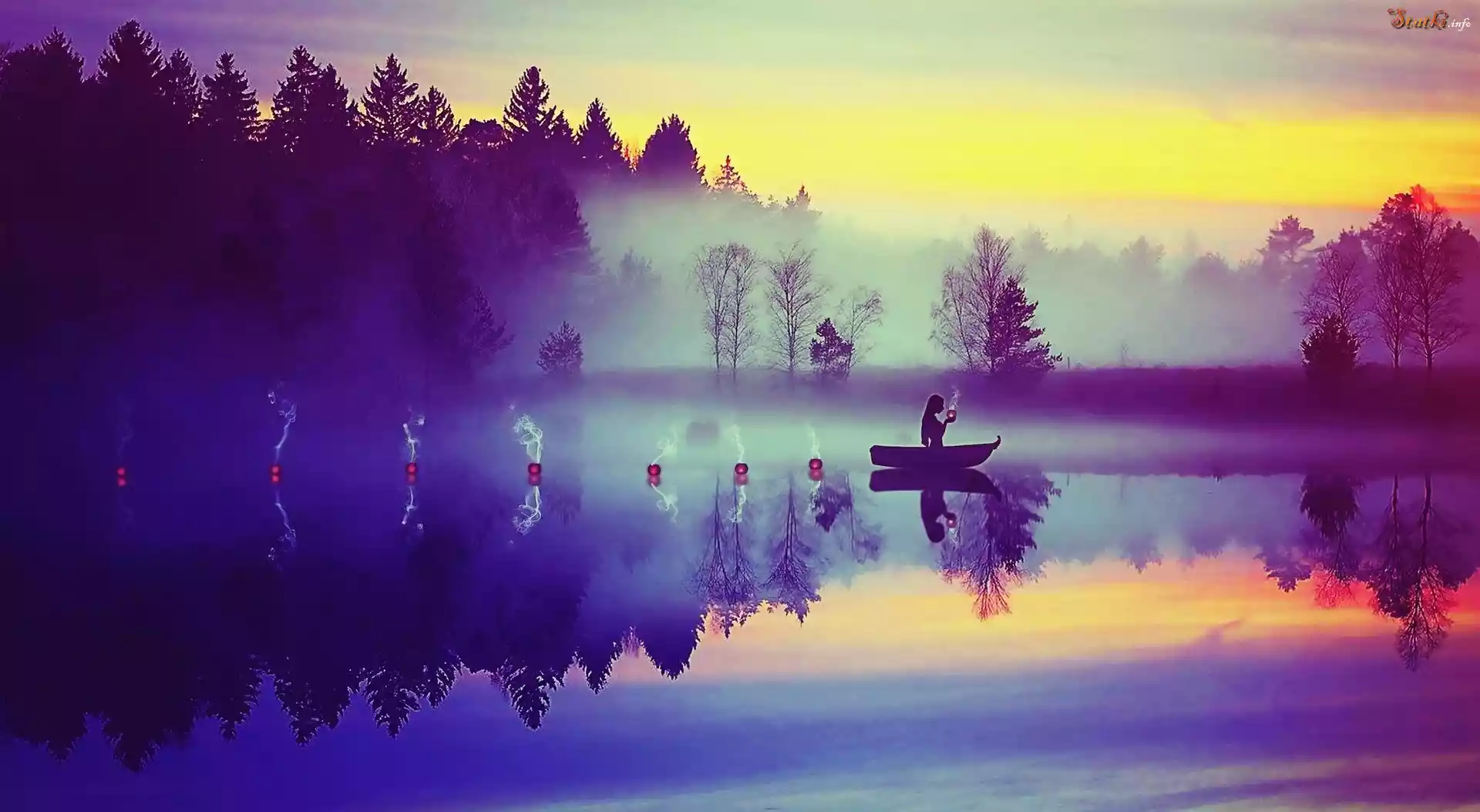 Jezioro, Drzewa, Mgła, Łódka, Kadzidełka , Zachód, Słońca