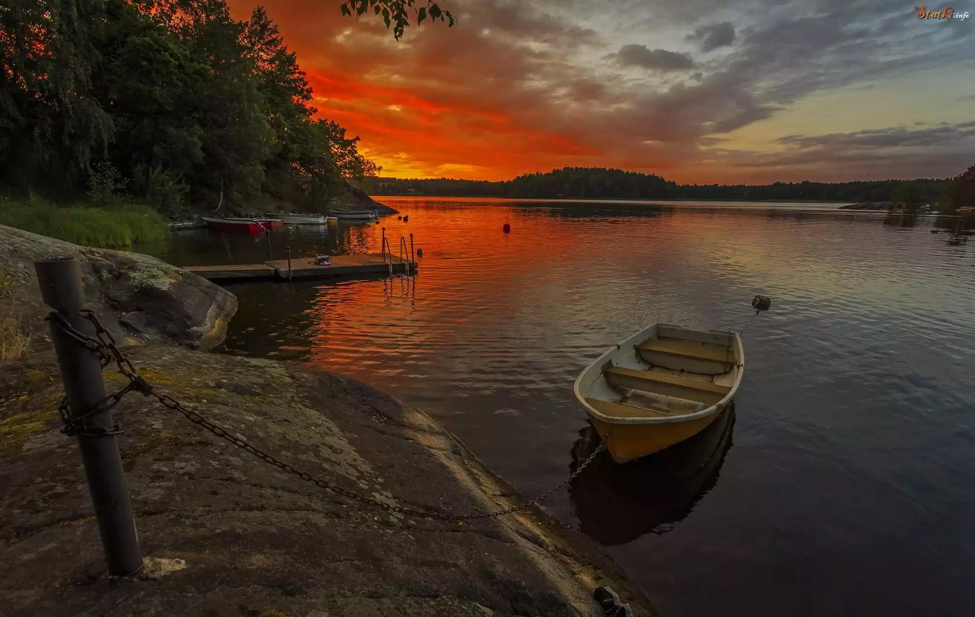 Statek Jezioro, Drzewa, Łódki, Kamienie, Pomost, Zachód, Słońca