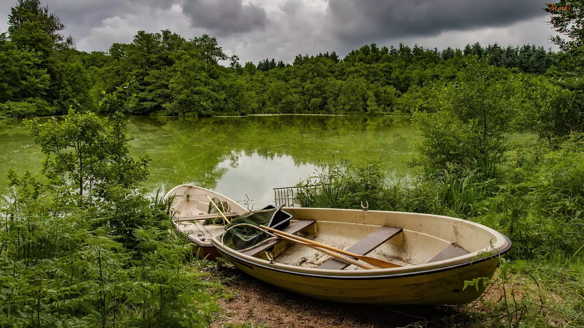 Statek Lato, Staw, Łódki, Drzewa