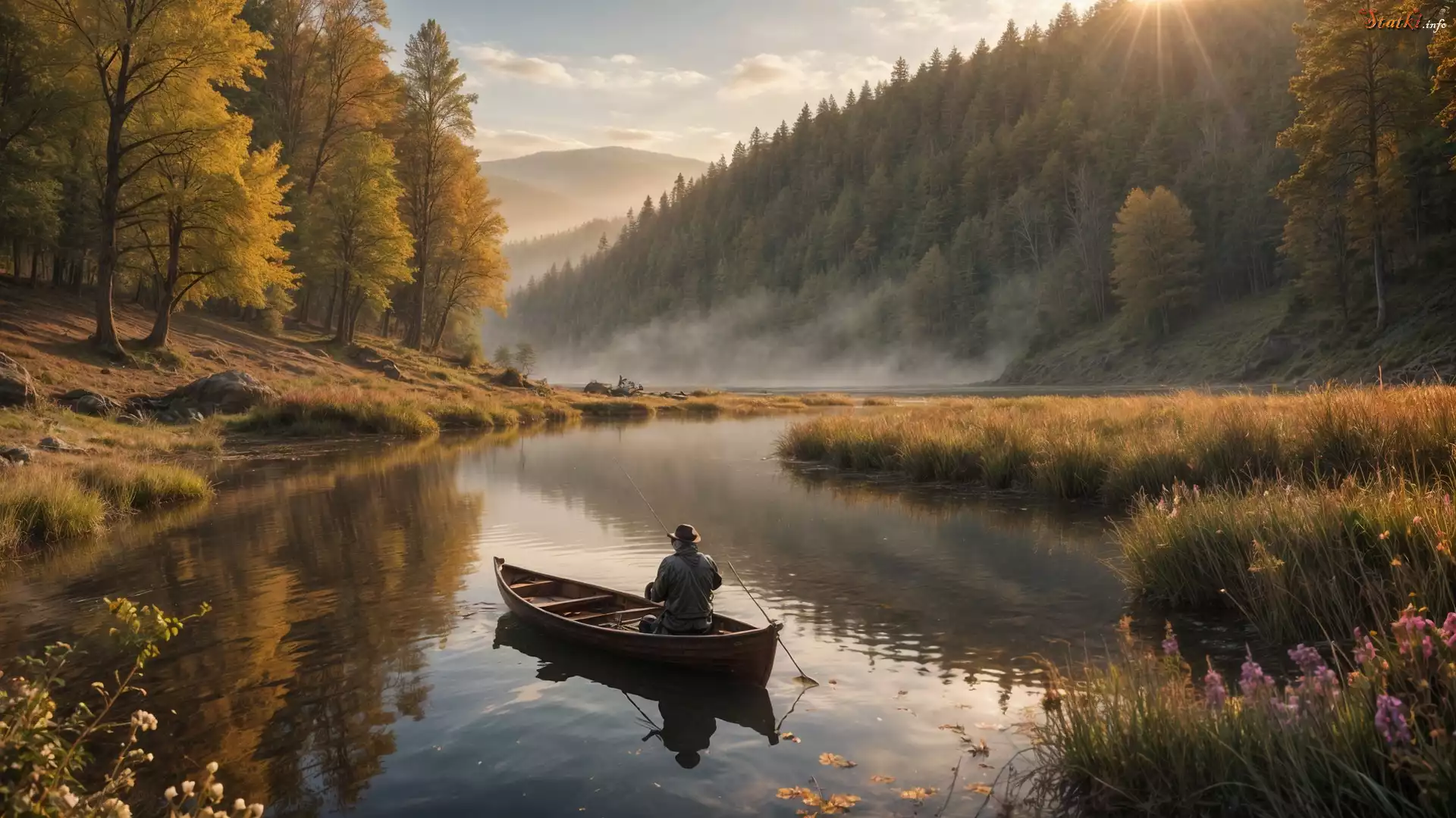 Wędkarz, Jezioro, Łódka, Drzewa, Jesień, Mgła