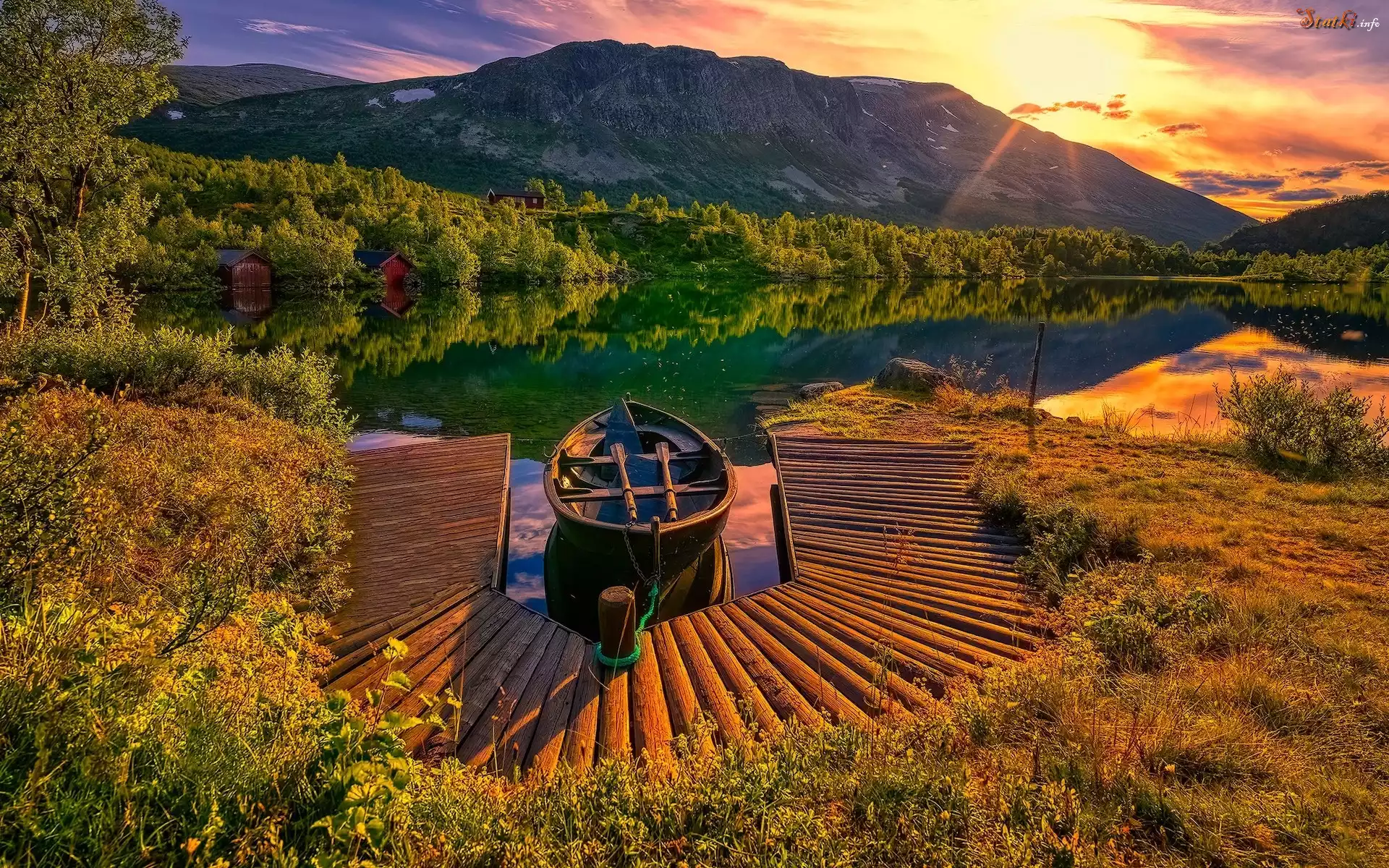 Statek Góry, Jezioro, Pomost, Łódka, Promienie słońca, Las, Drzewa