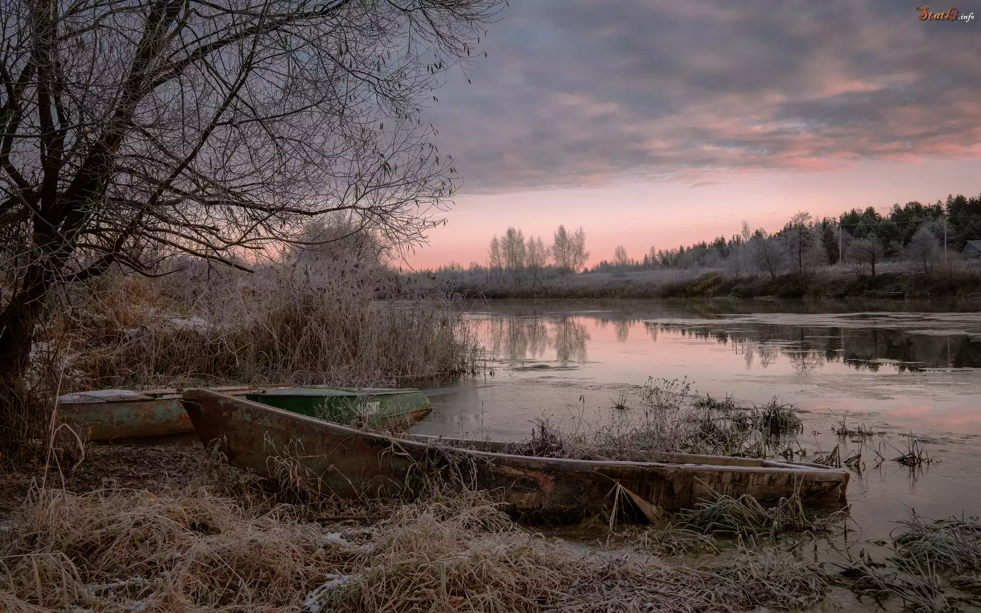 Statek Łotwa, Rzeka, Dubna, Mgła, Łódka, Szuwary, Szron, Drzewo