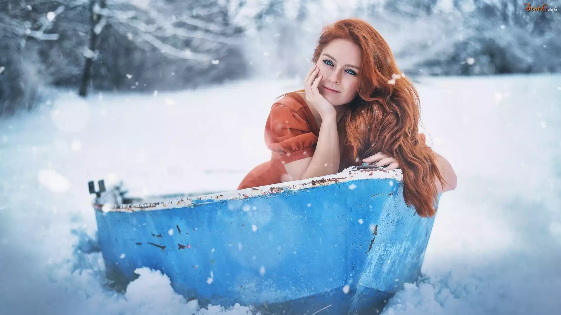 Rudowłosa, Dziewczyna, Łódka, Śnieg, Zima