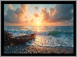 Morze, Łódka, Plaża, Fale, Zachód słońca