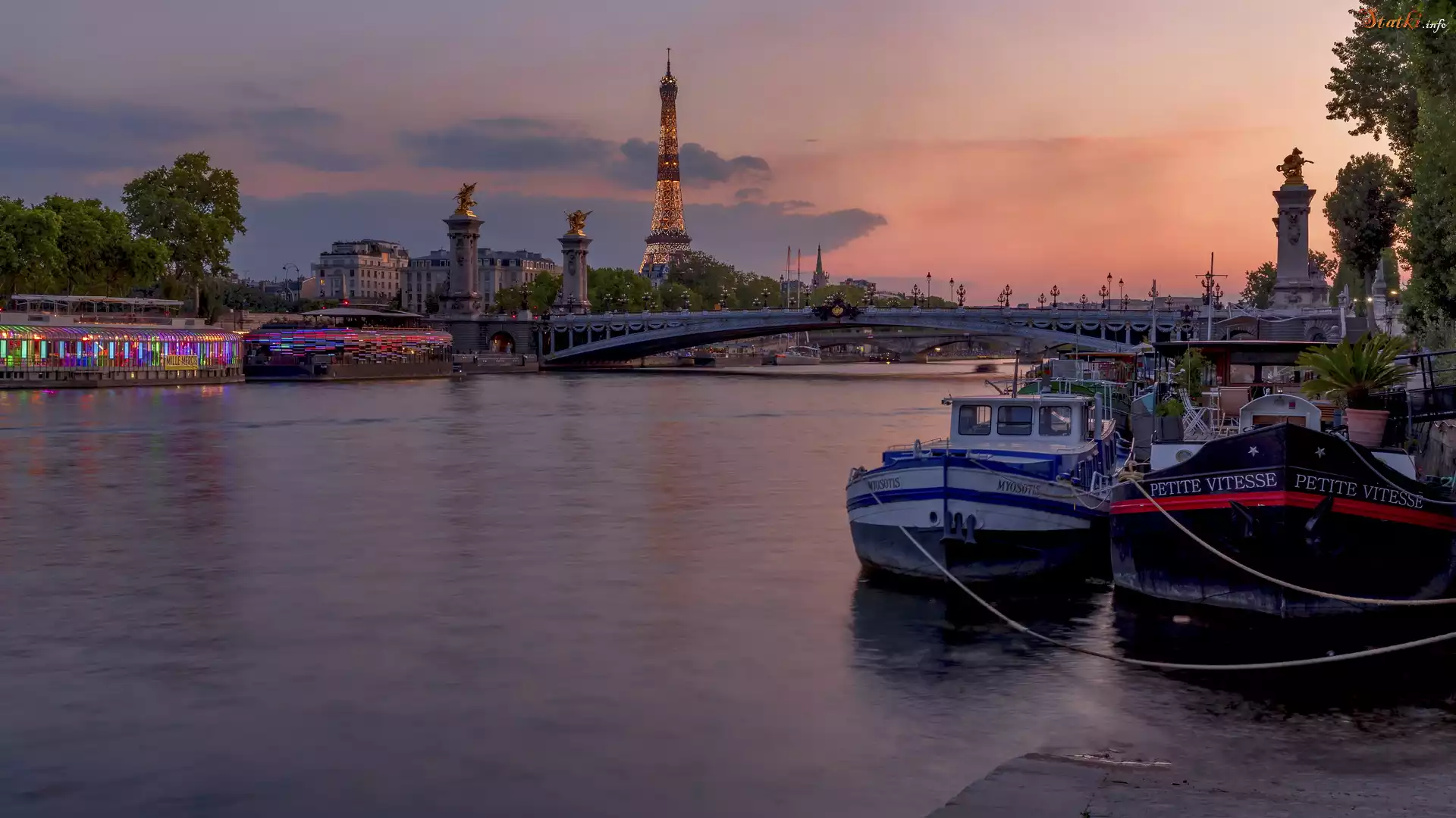 Rzeka Sekwana, Łódki, Most Aleksandra III, Wieża Eiffla, Paryż, Francja