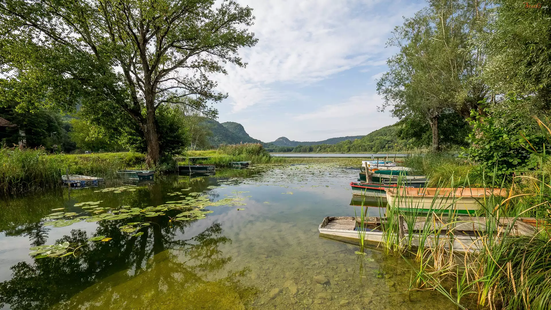 Jezioro Barterand, Łódki, Brzeg, Drzewa, Góry, Miejscowość Pollieu, Francja
