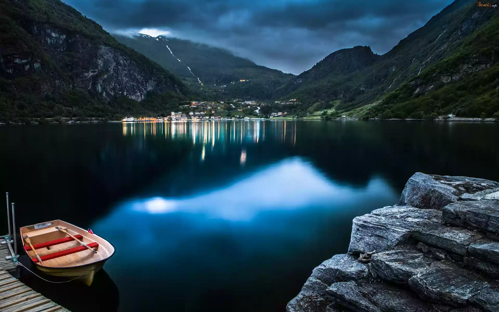 Norwegia, Fiord Geiranger, Góry, Odbite, Światła, Łódka