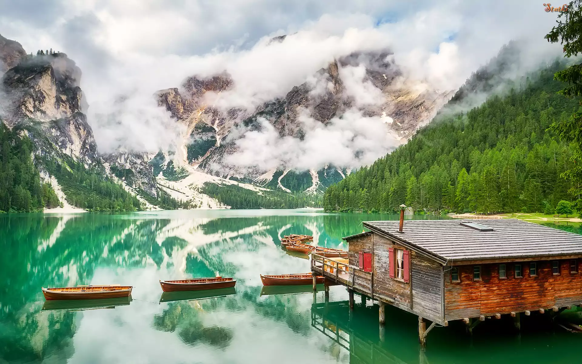 Statek Góry, Dolomity, Jezioro, Pragser Wildsee, Łódki, Lasy, Mgła, Dom, Drewniany