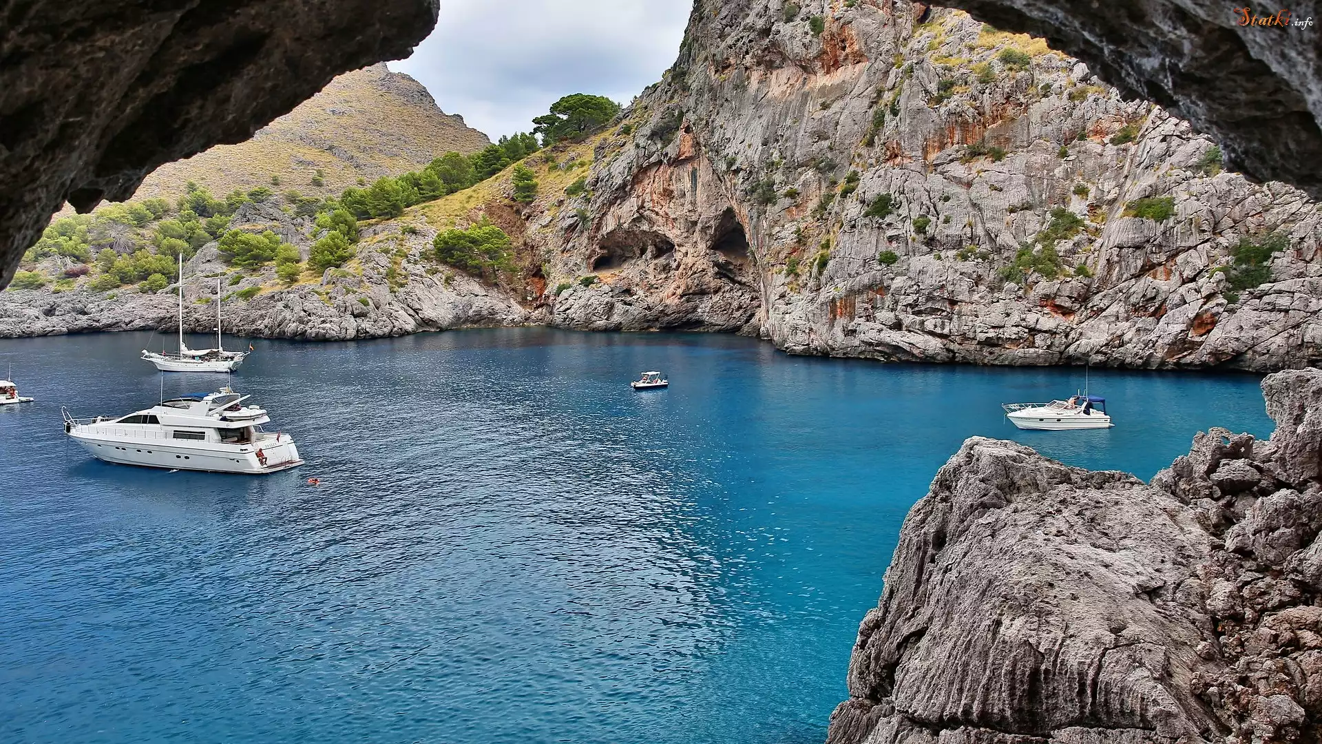 Góry, Skały, Jezioro, Jacht, Motorówki