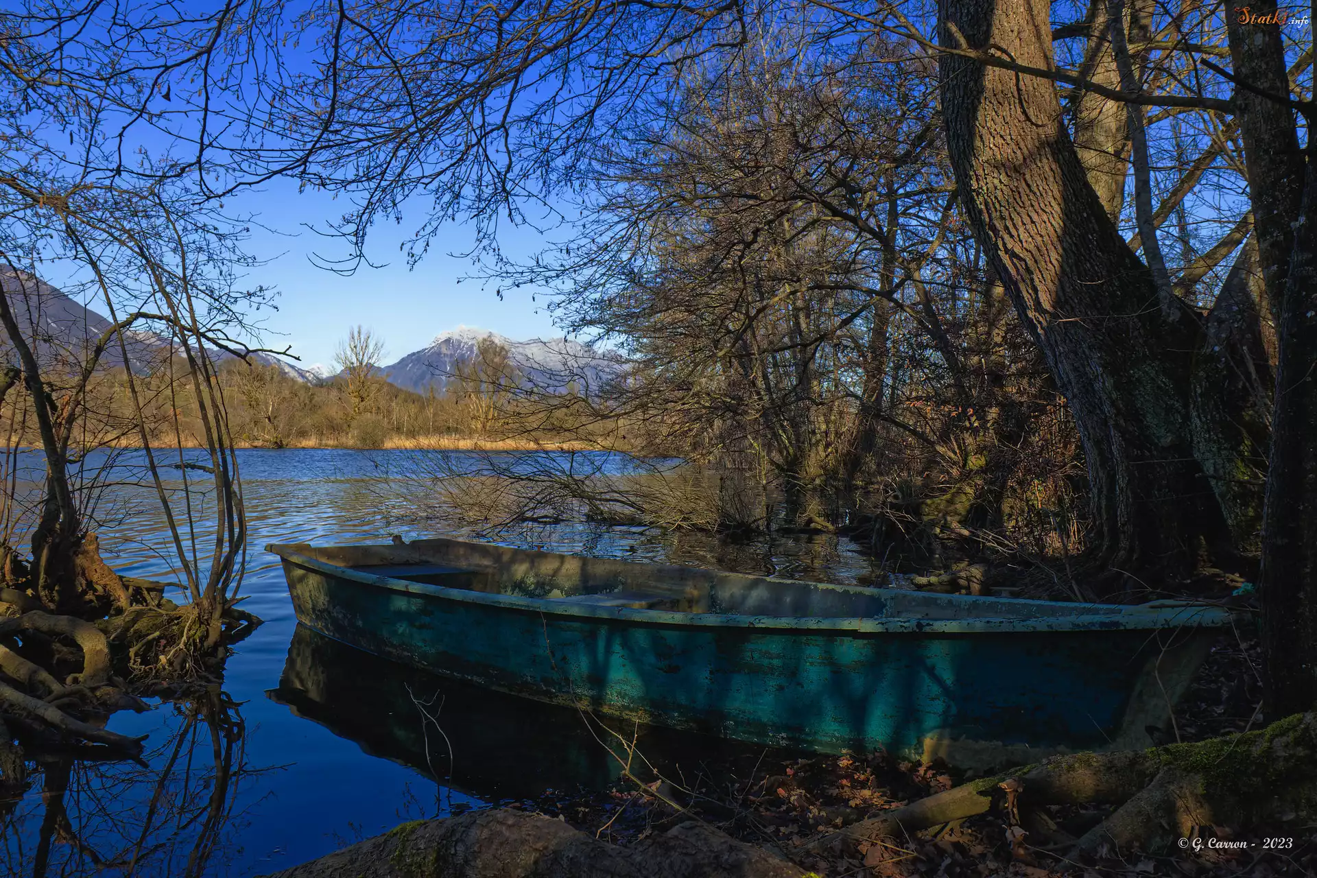 Statek Łódka, Drzewo, Jezioro, Góry