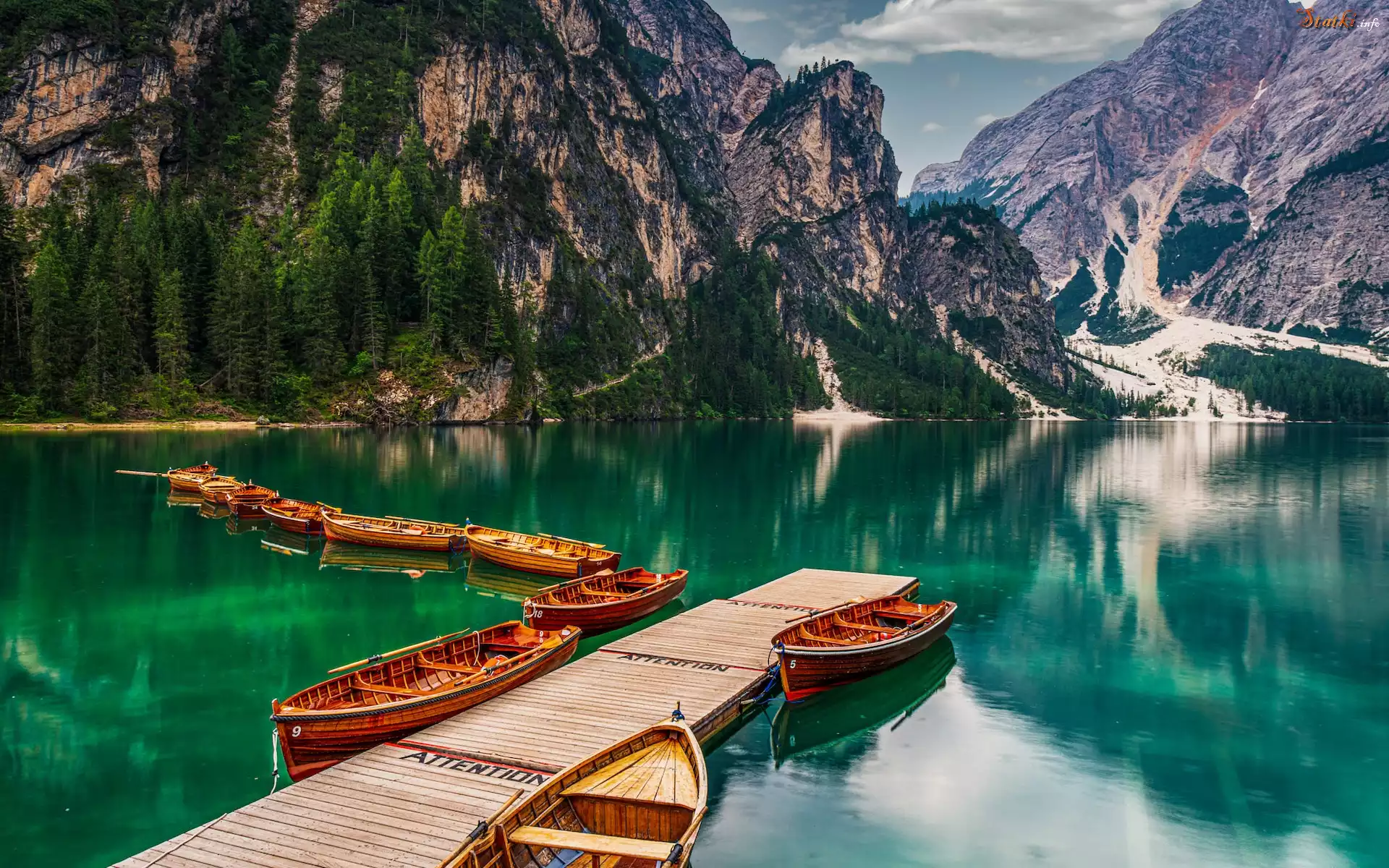 Góry, Dolomity, Jezioro, Pragser Wildsee, Pomost, Łódki, Drzewa, Włochy