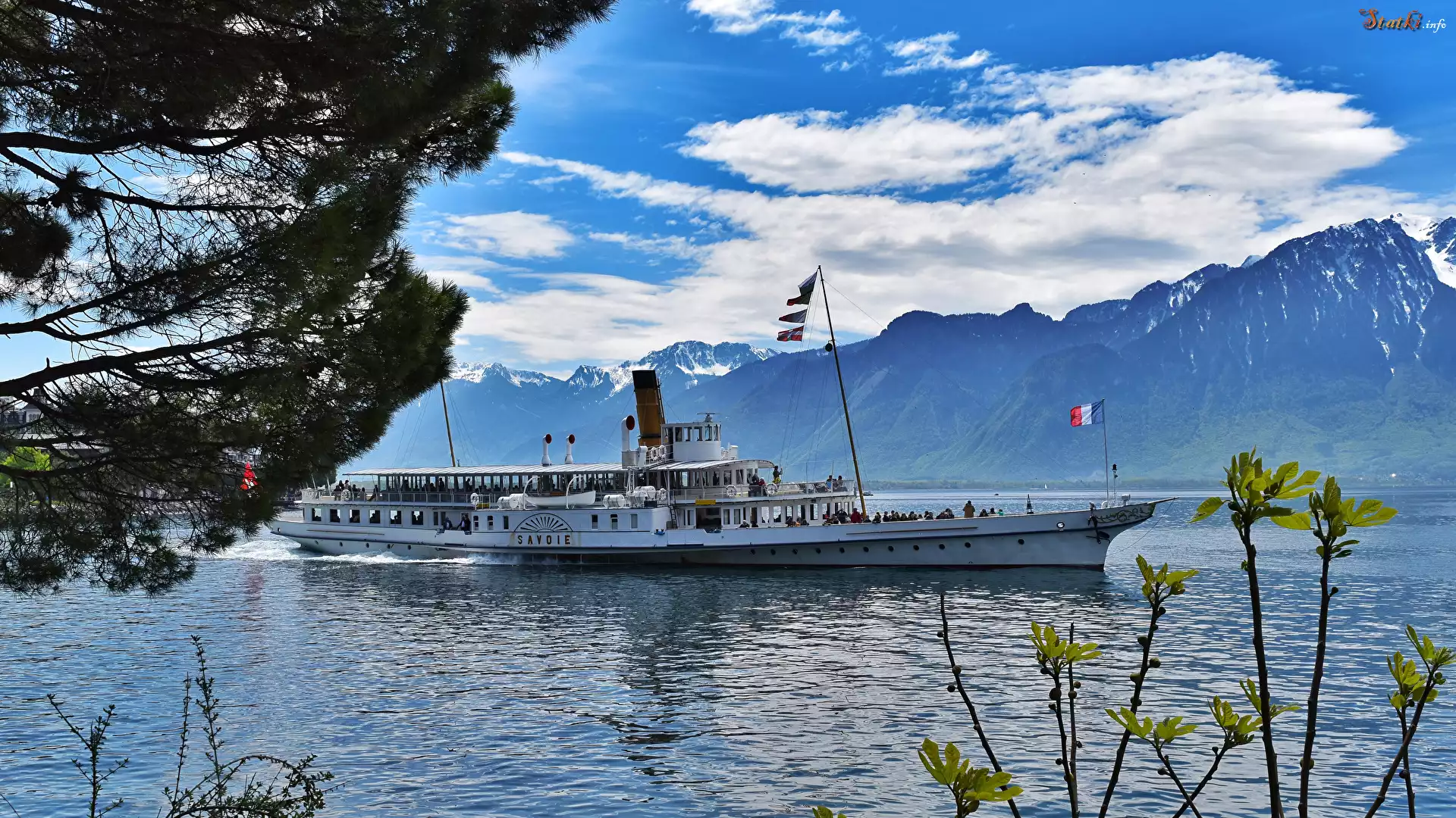 Statek Jezioro, Góry, Niebo, Gałęzie, Statek