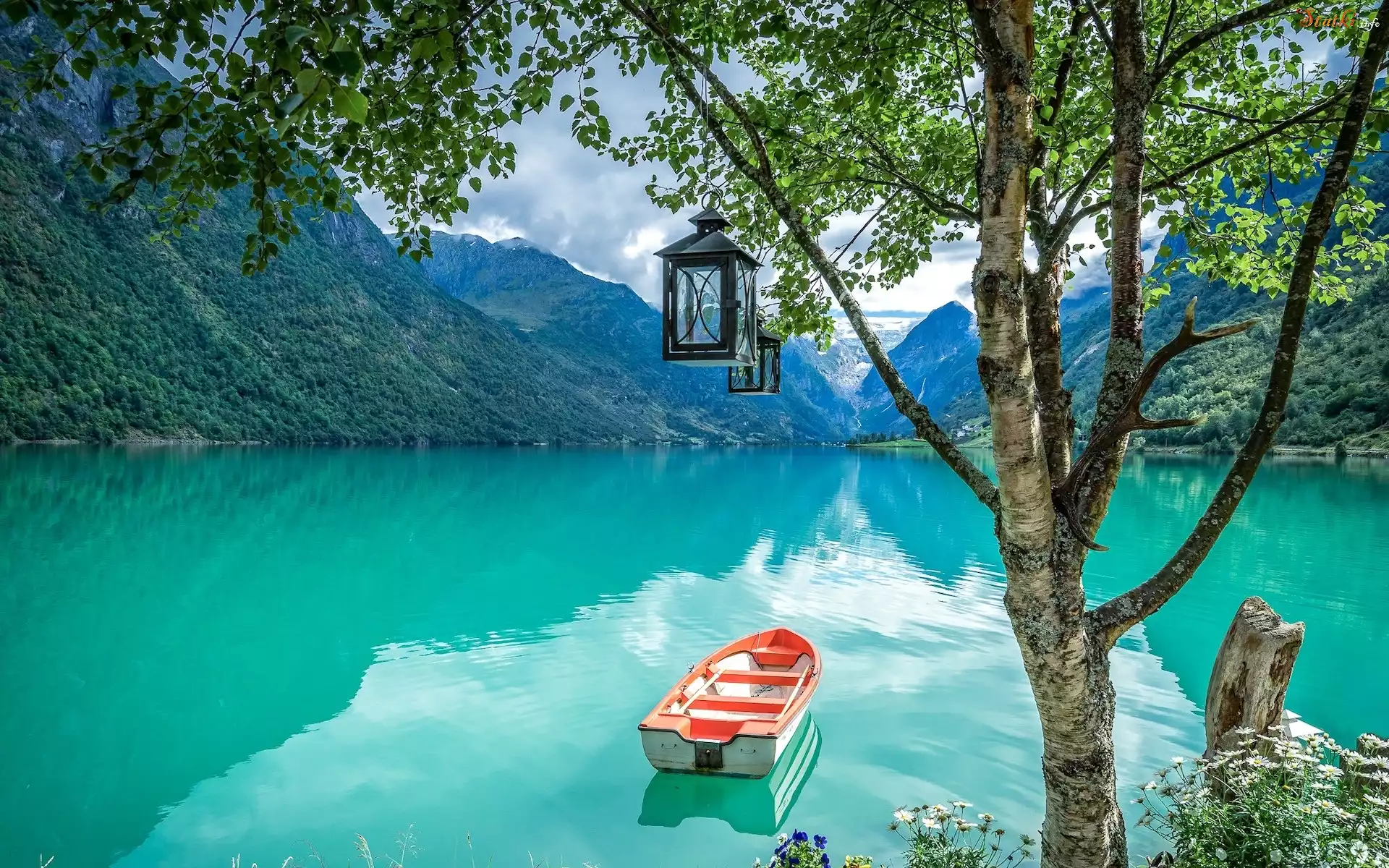 Norwegia, Oldedalen, Rzeka, Góry, Brzoza, Łódka, Latarnia