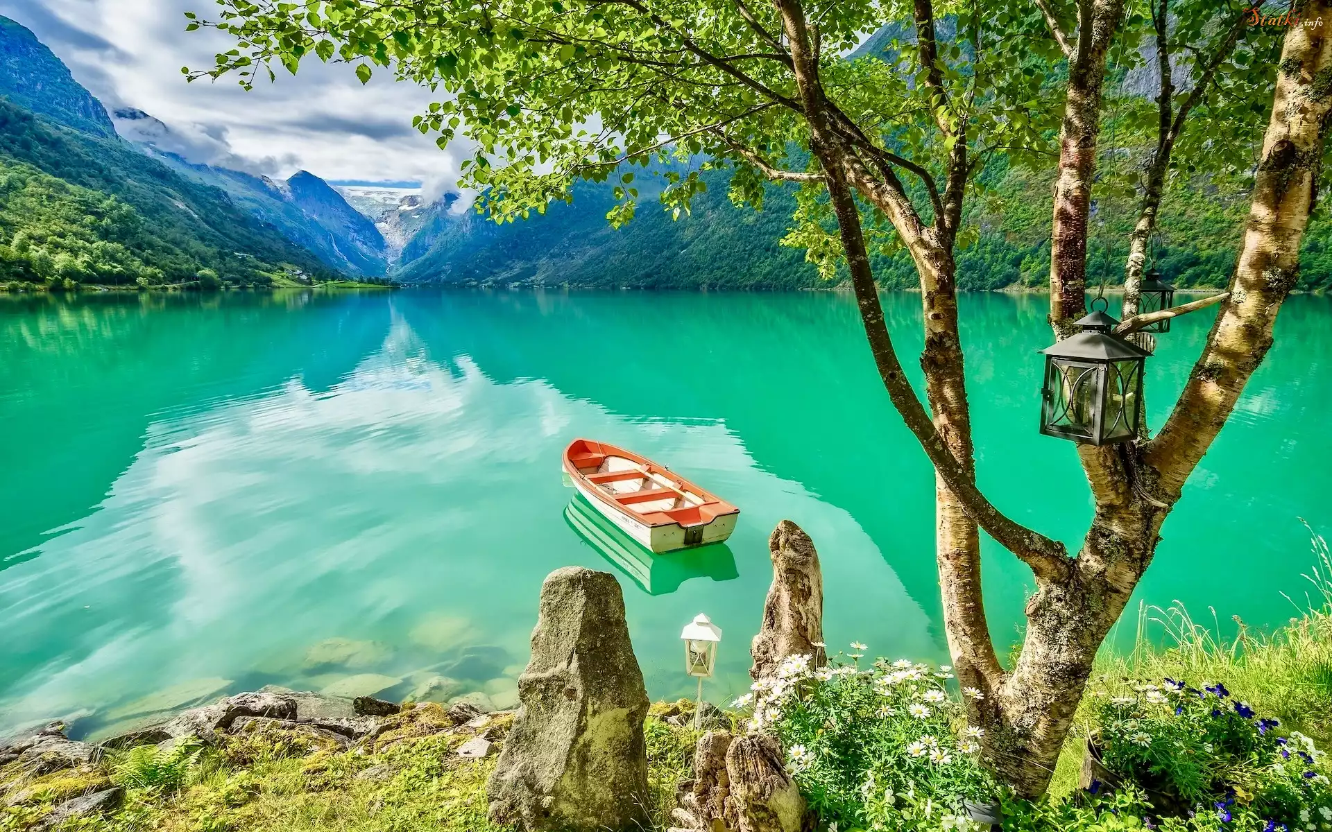 Norwegia, Oldedalen, Rzeka, Góry, Brzoza, Łódka, Latarnie