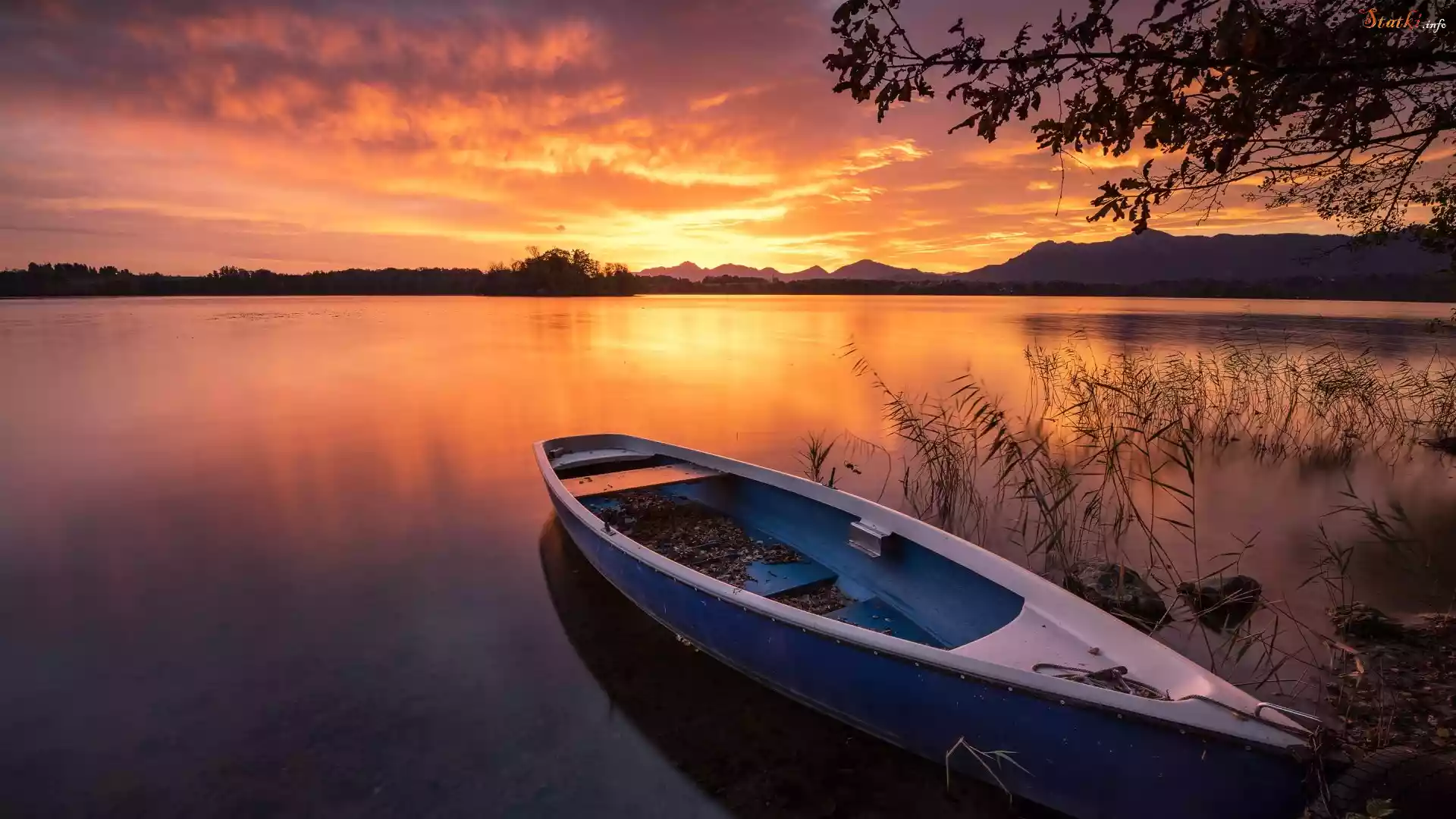 Statek Góry, Jezioro, Łódka, Drzewa, Zachód słońca