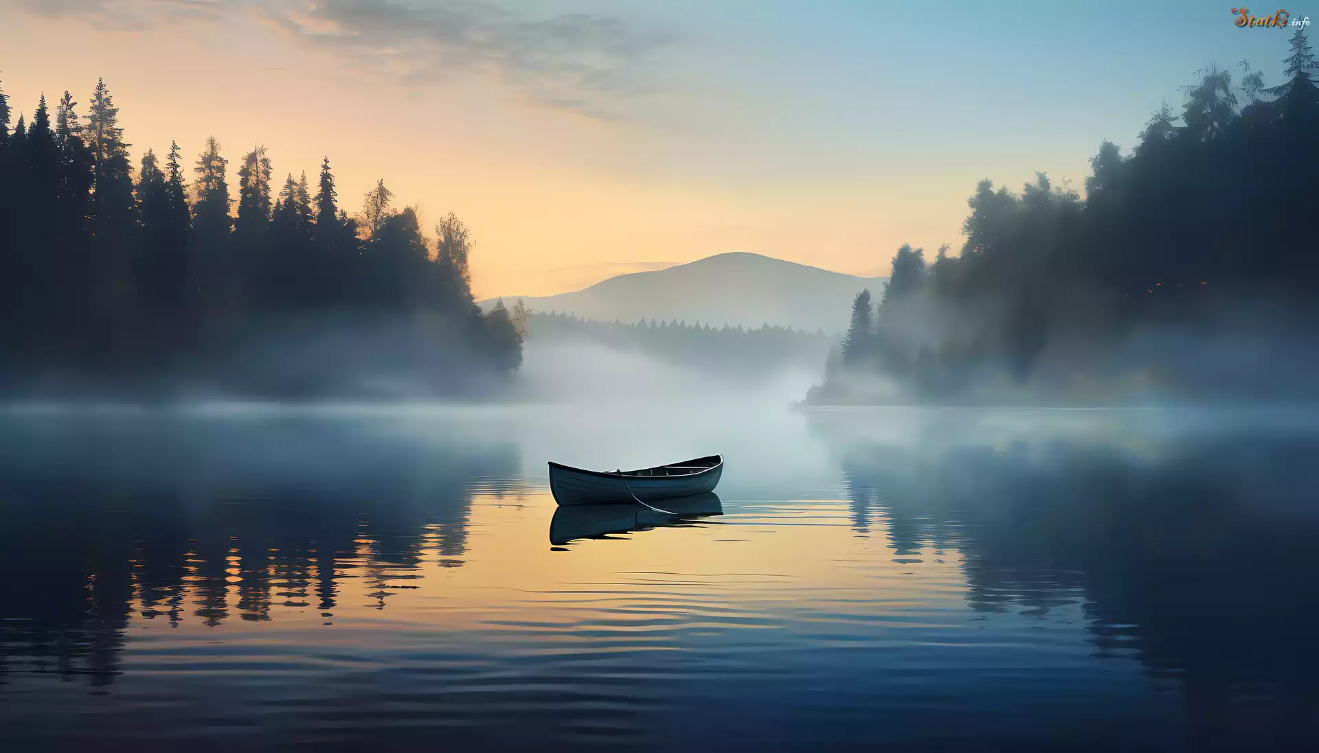Statek Jezioro, Łódka, Drzewa, Grafika