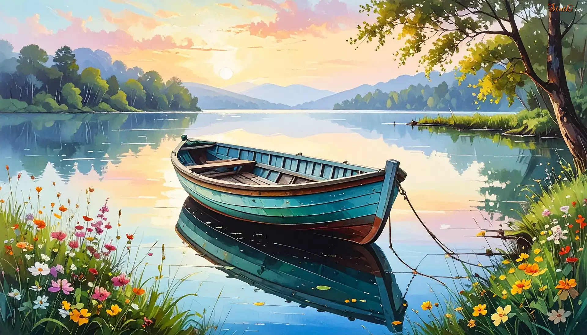 Jezioro, Łódka, Kwiaty, Grafika