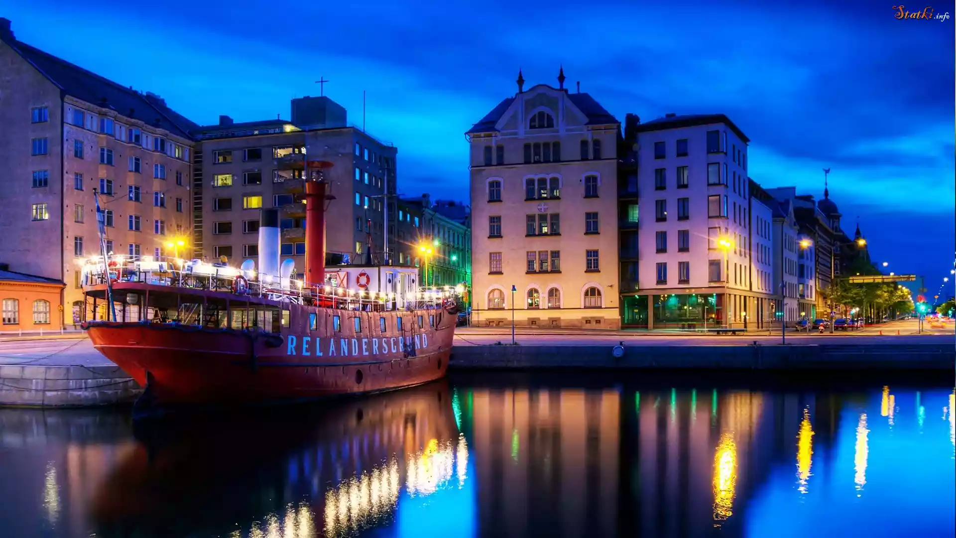 Statek Helsinki, Nocą, Domy, Nabrzeże, Wycieczkowy, Statek