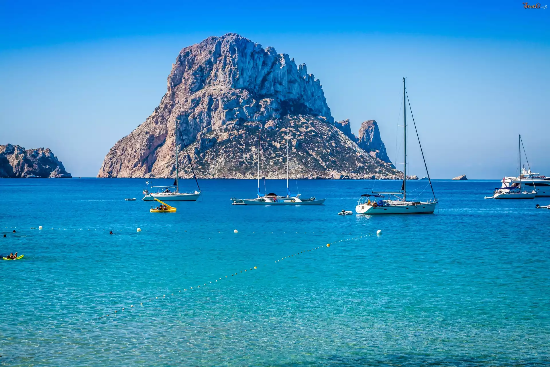 Statek Ibiza, Hiszpania, Morze, Skały, Łódki