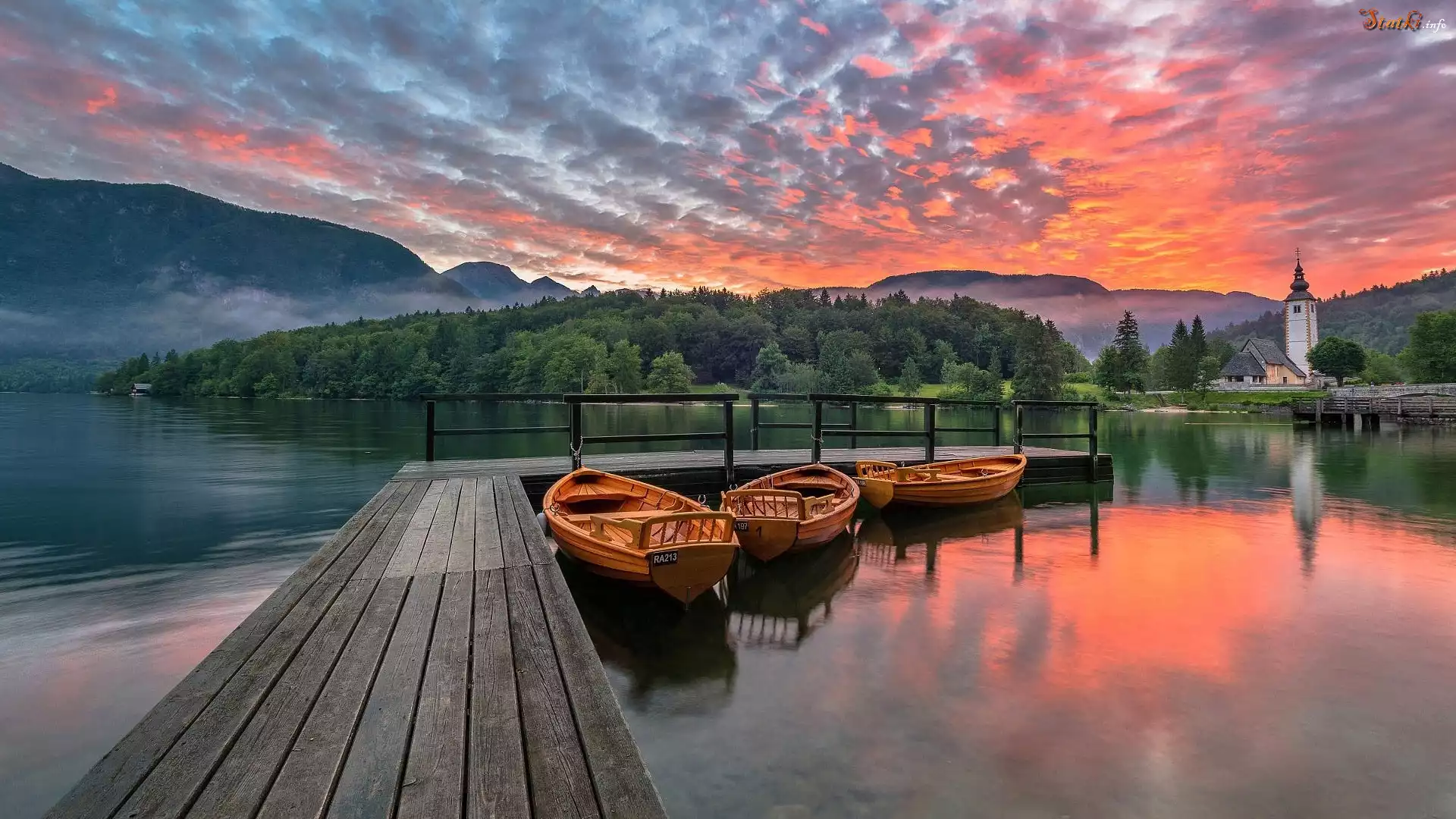 Pomost, Łódki, Kościół św Jana, Jezioro Bohinj, Drzewa, Wschód słońca, Chmury, Gmina Bohinj, Słowenia |