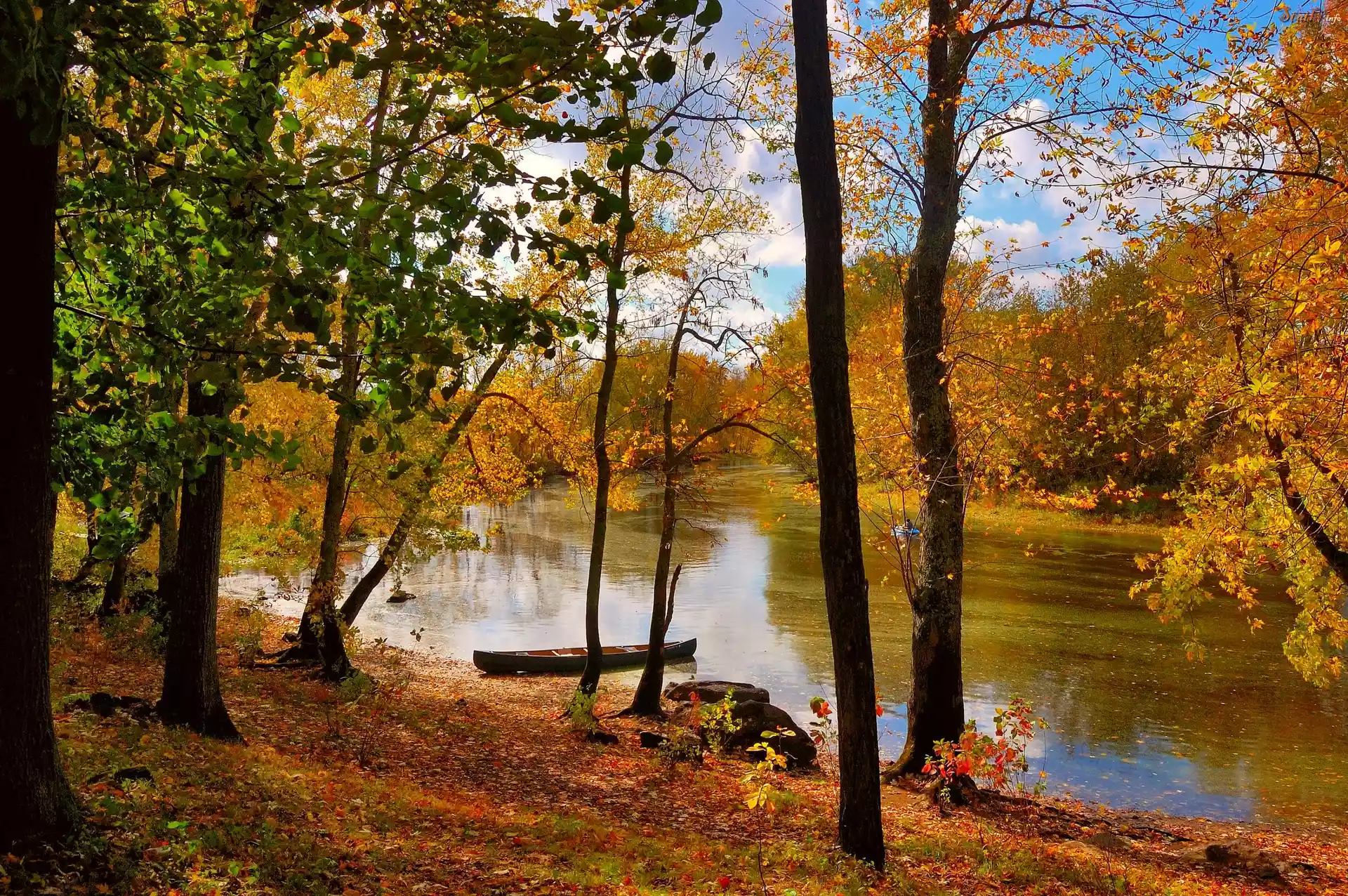 Statek Jesień, Drzewa, Rzeka, Łódka