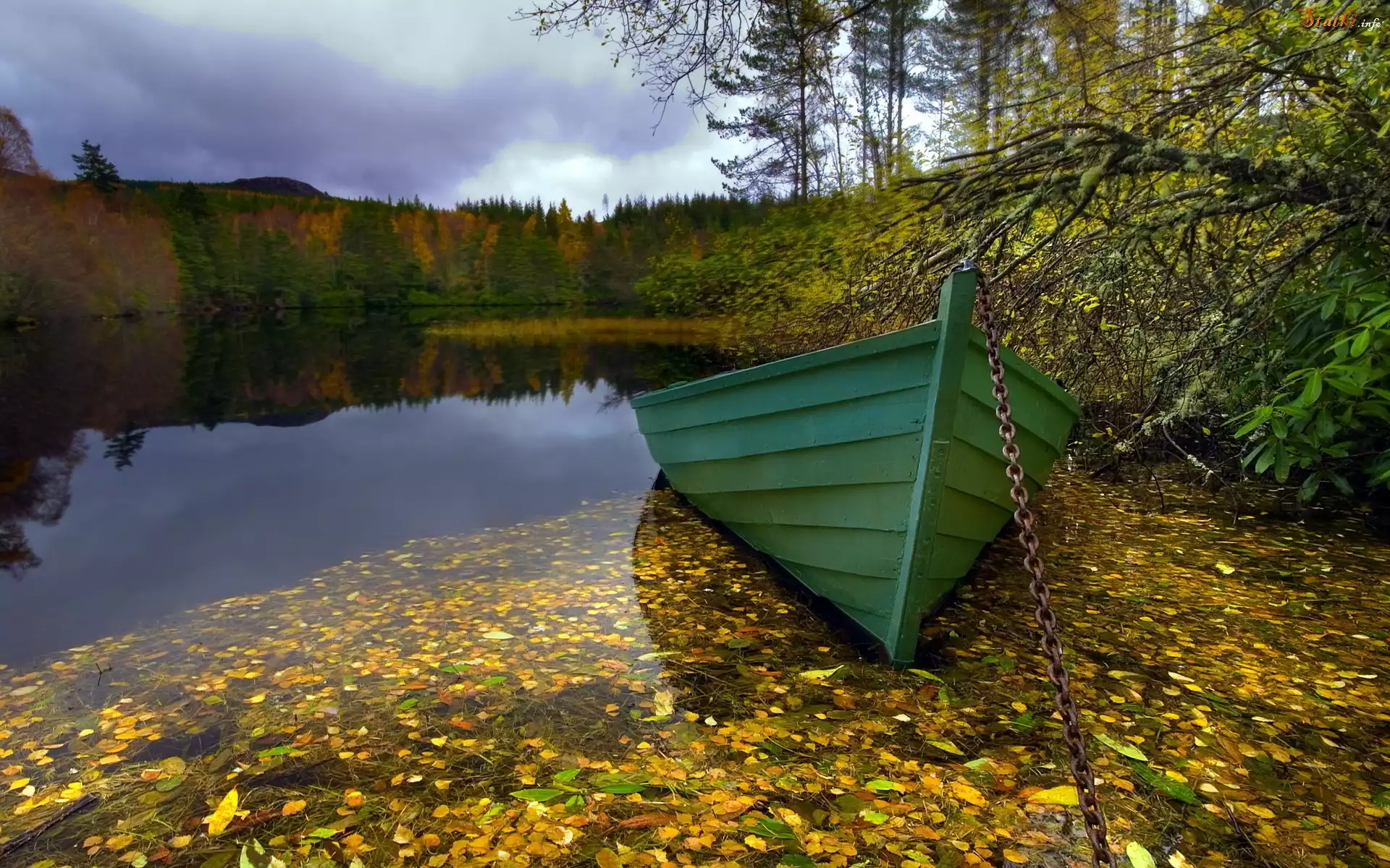 Statek Jesień, Jezioro, Drzewa, Liście, Zielona, Łódź