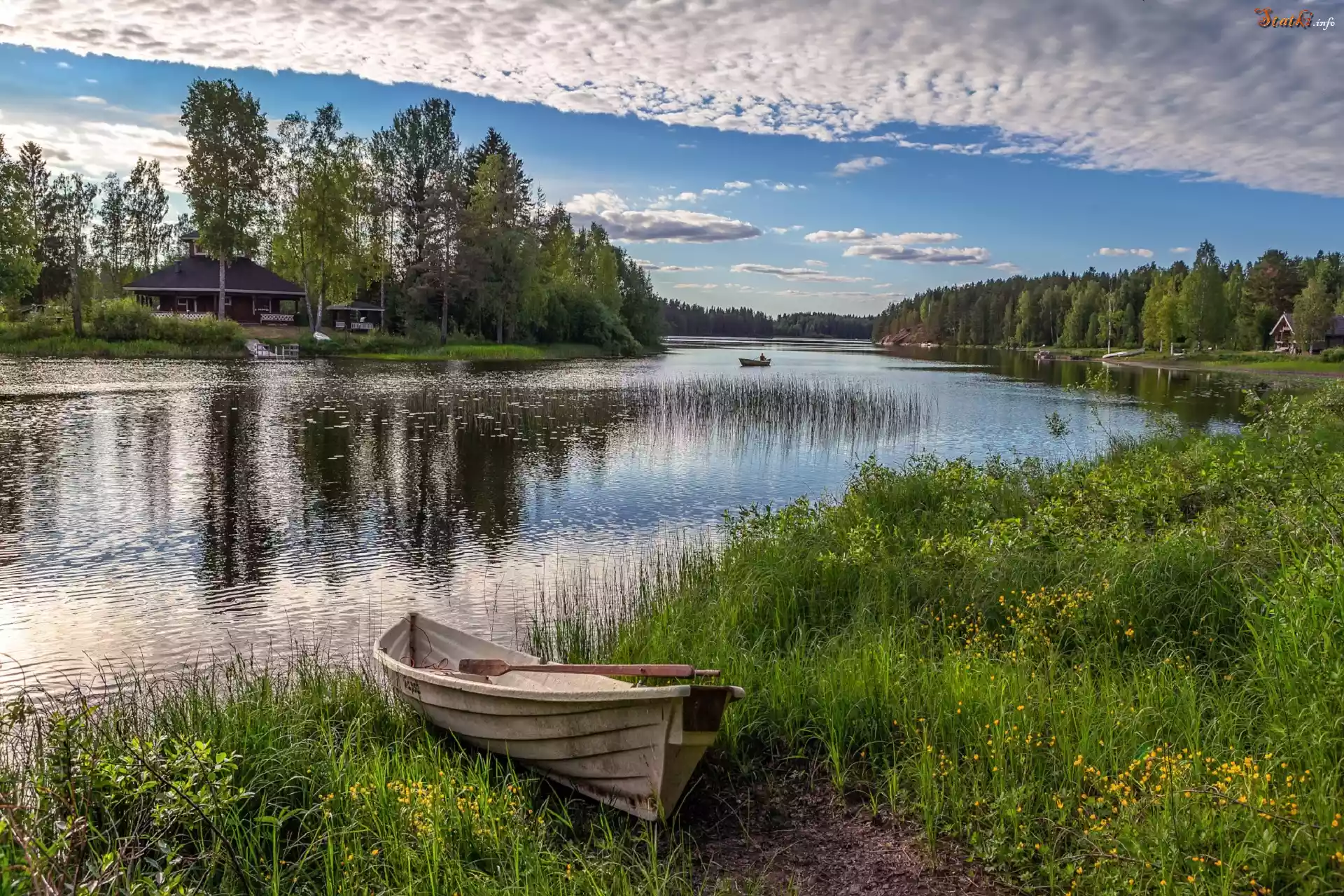 Jezioro, Łódka, Szuwary, Chmury, Domki